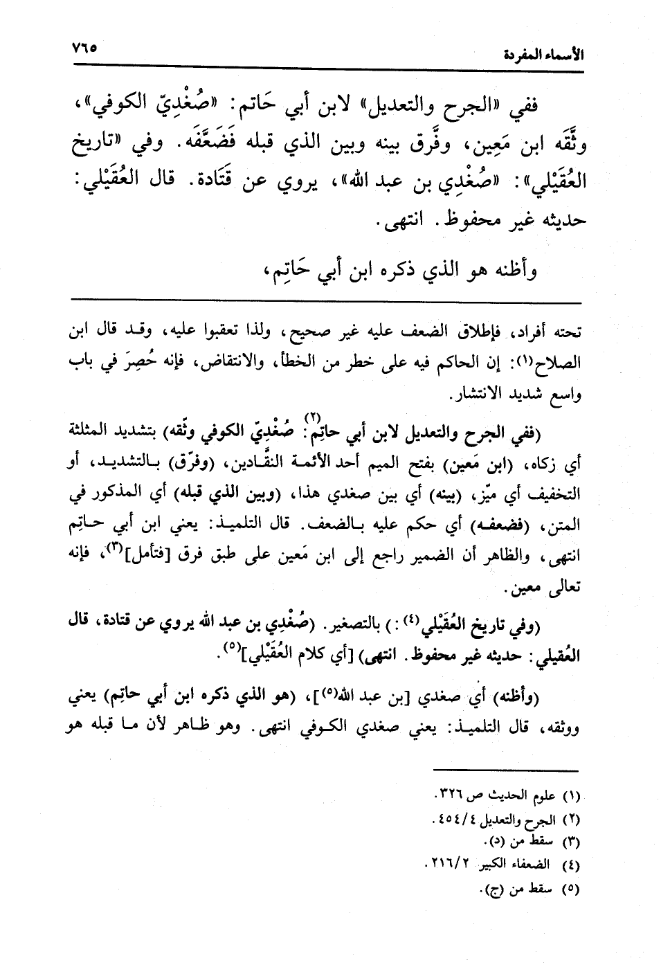 (فَفِي الْجرْح وَالتَّعْدِيل لِابْنِ أبي حاتِم: صُغْدي الْكُوفِي وثَقة) بتَشْديد الْمُثَلَّثَة أَي زَكَّاهُ، (ابْن مَعين) بِفَتْح الْمِيم أحد الْأَئِمَّة النقادين، (وفرّق) بِالتَّشْدِيدِ، أَو التَّخْفِيف أَي ميز، (بَينه) أَي بَين صغدي هَذَا، (وَبَين الَّذِي قبله) أَي الْمَذْكُور فِي الْمَتْن، (فضعفه) أَي حكم عَلَيْهِ بالضعيف. قَالَ التلميذ: يَعْنِي ابْن أبي حَاتِم انْتهى، وَالظَّاهِر أَن الضَّمِير رَاجع إِلَى ابْن مَعين على طبق فرق [فَتَأمل] ، فَإِنَّهُ تَعَالَى معِين.