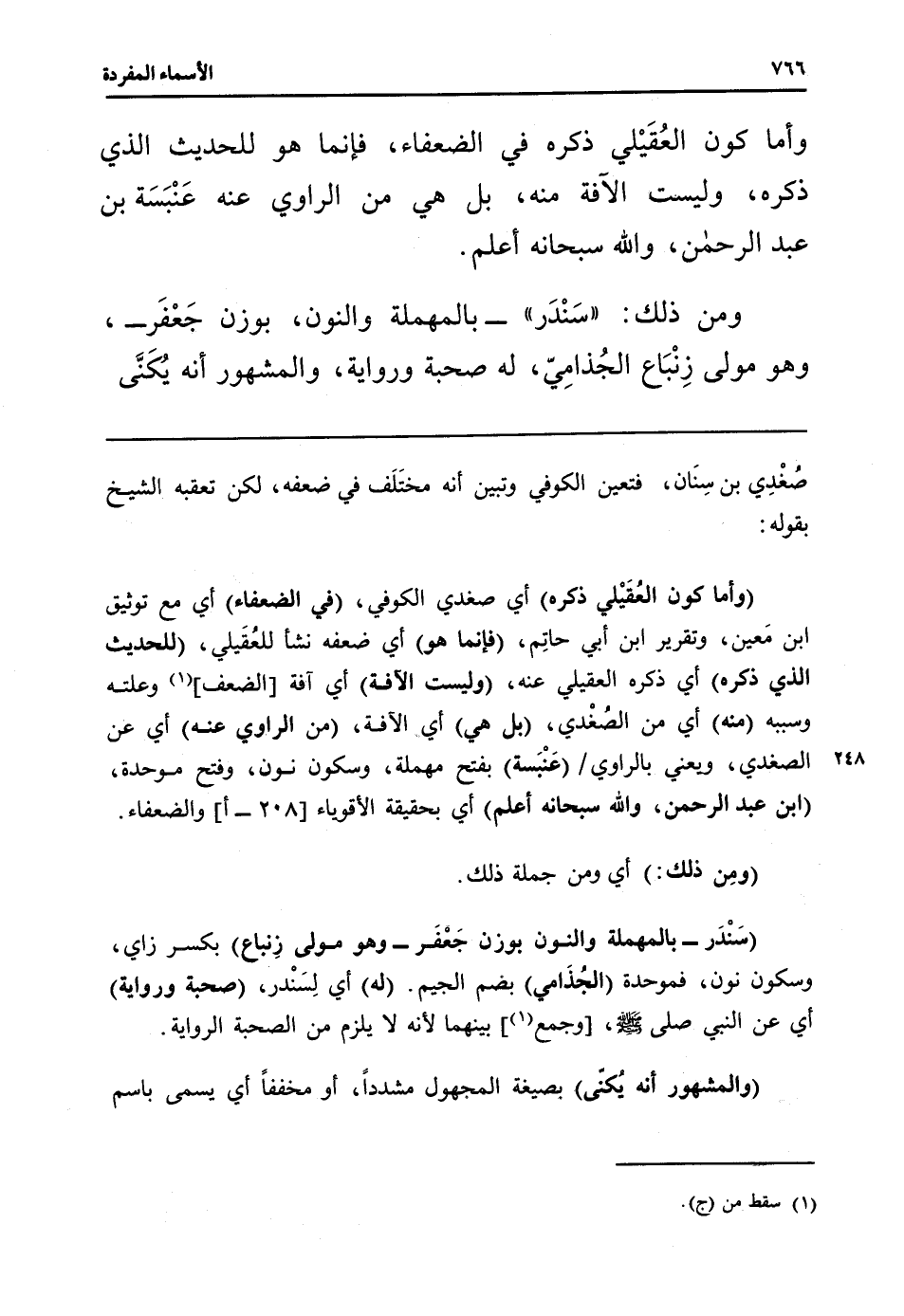 (وَأما كَون العُقَيْلي ذكره) أَي صغدي الْكُوفِي، (فِي الضُّعَفَاء) أَي مَعَ تَوْثِيق ابْن مَعين، وَتَقْرِير ابْن أبي حَاتِم، (فَإِنَّمَا هُوَ) أَي ضعفه نَشأ للعُقَيلي، (للْحَدِيث الَّذِي ذكره) أَي ذكره الْعقيلِيّ عَنهُ، (وَلَيْسَت الآفة) أَي آفَة [الضعْف] وعلته وَسَببه (مِنْهُ) أَي مَعَ الصُغدي، (بل هِيَ) أَي الآفة، (من الرَّاوِي عَنهُ) أَي عَن الصغدي، وَيَعْنِي بالراوي / (عَنْبَسة) بِفَتْح مُهْملَة، وَسُكُون نون، وَفتح مُوَحدَة، (ابْن عبد الرَّحْمَن، وَالله سُبْحَانَهُ أعلم) أَي بِحَقِيقَة الأقوياء [208 - أ] والضعفاء.