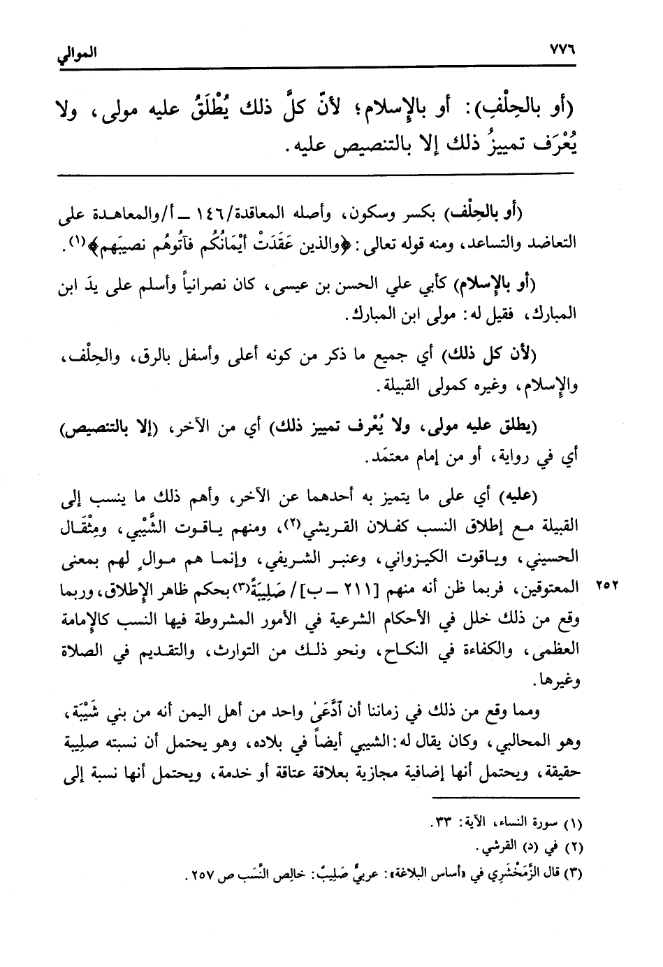 (عَلَيْهِ) أَي على مَا يتَمَيَّز بِهِ أَحدهمَا عَن الآخر، وأهم ذَلِك مَا ينْسب إِلَى الْقَبِيلَة مَعَ إِطْلَاق النّسَب كفلان القريشي، وَمِنْهُم ياقوت الشيبي، ومثقال الْحُسَيْنِي، وَيَاقُوت الكيزواني، وَعَنْبَر الشريفي، وَإِنَّمَا هم موَالٍ لَهُم بِمَعْنى المعتوقين، فَرُبمَا ظن أَنه مِنْهُم [211 - ب] / صليبة بِحكم ظَاهر الْإِطْلَاق، وَرُبمَا وَقع من ذَلِك خلل فِي الْحُكَّام الشَّرْعِيَّة فِي الْأُمُور الْمَشْرُوطَة فِيهَا النّسَب كالإمامة الْعُظْمَى، والكفاءة فِي النِّكَاح، وَنَحْو ذَلِك من التَّوَارُث، والتقديم فِي الصَّلَاة وَغَيرهَا.