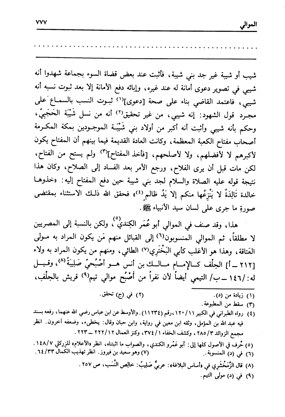 هَذَا، وَقد صنف فِي الموَالِي أَبُو عمر الْكِنْدِيّ، وَلَكِن بِالنِّسْبَةِ إِلَى المصريين لَا مُطلقًا، ثمَّ الموَالِي المنسوبون إِلَى الْقَبَائِل مِنْهُم من يكون المُرَاد بِهِ مولى الْعتَاقَة، وَهَذَا هُوَ الْأَغْلَب كَأبي البخْترِي الطَّائِي، وَمِنْهُم من يكون المُرَاد بِهِ وَلَاء [212 - أ] الْحلف كَالْإِمَامِ مَالك بن أنس هُوَ أصبحي صليبة، وَقيل لَهُ: / 146 - ب / التَّيْمِيّ أَيْضا لِأَن نَفرا من أصبح موَالِي تيم قُرَيْش بِالْحلف