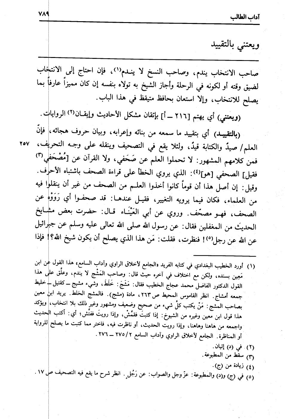 (بالتقييد) أَي بتقييد مَا سَمعه من بنائِهِ وَإِعْرَابه، وَبَيَان حُرُوف هجائه، فَإِن الْعلم / صيدٌ وَالْكِتَابَة قيدٌ، وَلِئَلَّا يَقع فِي التَّصْحِيف وينقله على وَجه التحريف، فَمن كَلَامهم الْمَشْهُور: لَا تحملوا الْعلم عَن صَحَفي، وَلَا الْقُرْآن عَن [مُصْحَفي فَقيل] الصحفي [هُوَ] : الَّذِي يروي الْخَطَأ على قِرَاءَة الصُّحُف باشتباه الأحرف. وَقيل: إِن أصل هَذَا أَن قوما كَانُوا أخذُوا الْعلم من الصُّحُف من غير أَن ينقلوا فِيهِ من الْعلمَاء، فَكَانَ فِيمَا يرويهِ التَّغْيِير، فَقيل عِنْدهَا: قد صحفوا أَي روَوْه عَن الصُّحُف، فَهُوَ مصحّف. وَرُوِيَ عَن أبي العَيْنَاء قَالَ: حضرت بعض مَشَايِخ الحَدِيث من المغفلين فَقَالَ: عَن رَسُول الله صلى الله تَعَالَى عَلَيْهِ وَسلم عَن جِبْرَائِيل عَن الله عَن رجل {فَنَظَرت، فَقلت: مَن هَذَا الَّذِي يصلح أَن يكون شيخ الله؟} فَإِذا
