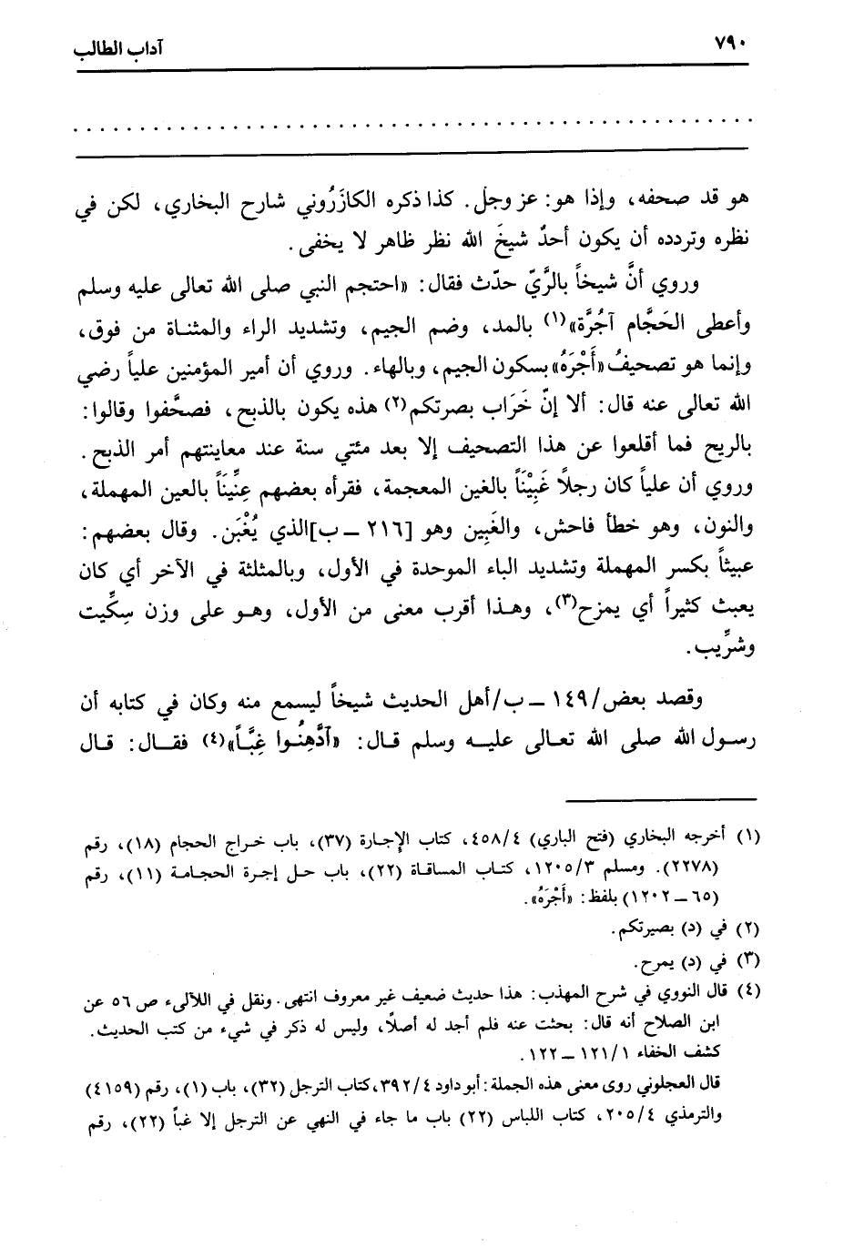 وَقصد بعض / 149 - ب / أهل الحَدِيث شَيخا ليسمع مِنْهُ وَكَانَ فِي كِتَابه أَن رَسُول الله صلى الله تَعَالَى عَلَيْهِ وَسلم قَالَ: {ادهِنوا غِبَّاً} فَقَالَ: قَالَ