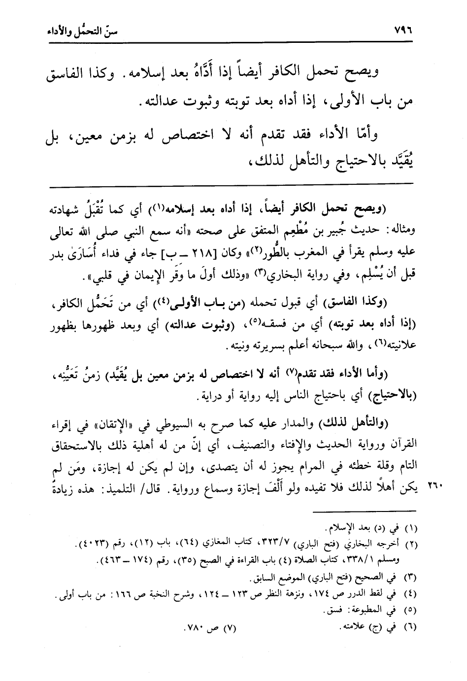 (وبصح تحمل الْكَافِر أَيْضا، إِذا أَدَّاهُ بعد إِسْلَامه) أَي كَمَا تُقْبَلُ شَهَادَته ومثاله: حَدِيث جُبير بن مُطْعِم الْمُتَّفق على صِحَّته " أَنه سمع النَّبِي صلى الله تَعَالَى عَلَيْهِ وَسلم يقْرَأ فِي الْمغرب بِالطورِ " وَكَانَ [218 - ب] جَاءَ فِي فدَاء أُسَارَى بدر قبل أَن يُسْلِم، وَفِي رِوَايَة البُخَارِيّ " وَذَلِكَ أولَ مَا وَقَر الْإِيمَان فِي قلبِي ".