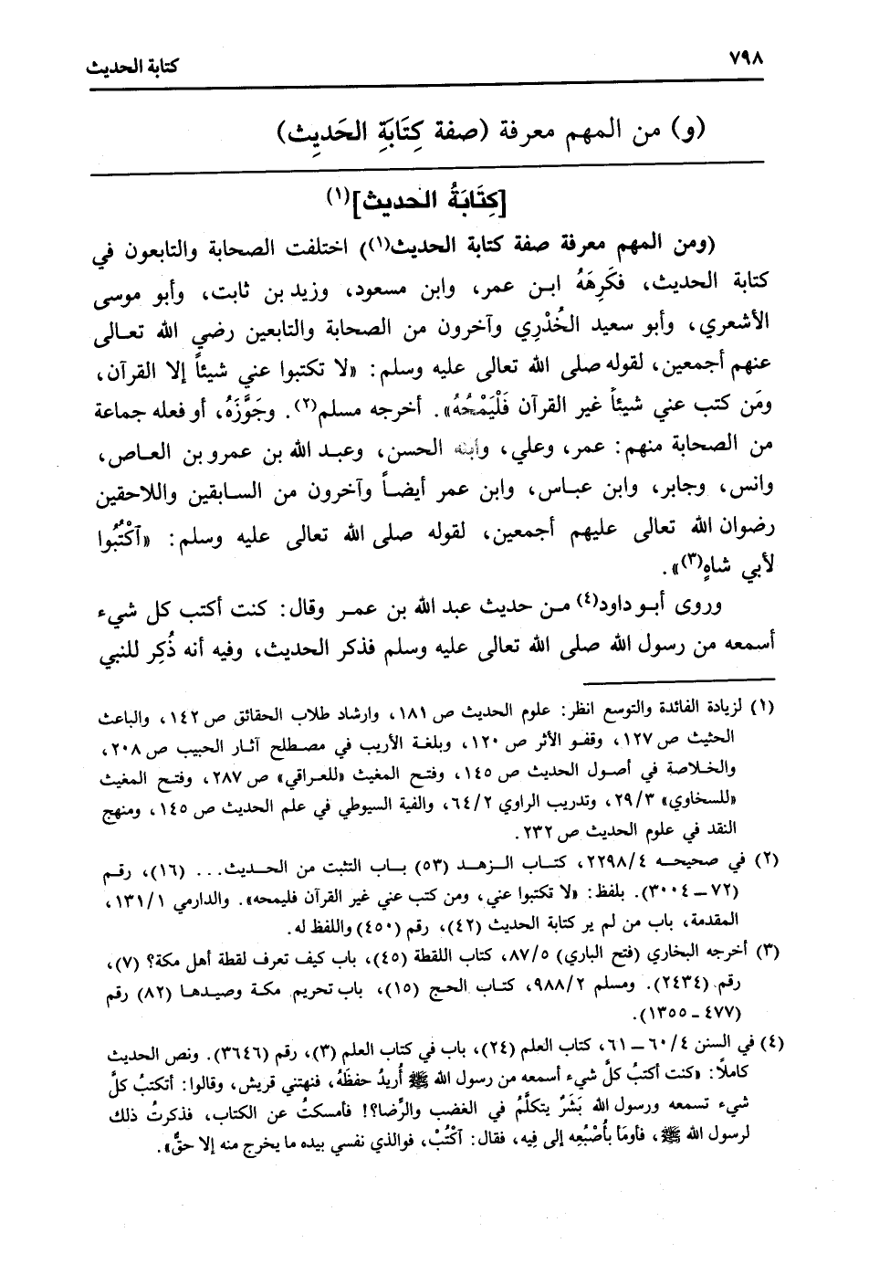 (وَمن المهم معرفَة صفة كِتَابَة الحَدِيث) اخْتلفت الصَّحَابَة والتابعون فِي كِتَابَة الحَدِيث، فكَرِهَهُ ابْن عمر، وَابْن مَسْعُود، وَزيد بن ثَابت، وَأَبُو مُوسَى الْأَشْعَرِيّ، وَأَبُو سعيد الخُدْرِي وَآخَرُونَ من الصَّحَابَة وَالتَّابِعِينَ رَضِي الله تَعَالَى عَنْهُم أَجْمَعِينَ، لقَوْله صلى الله تَعَالَى عَلَيْهِ وَسلم: " لَا تكْتبُوا عني شَيْئا إِلَّا الْقُرْآن، ومَن كتب عني شَيْئا غير الْقُرْآن فَلْيَمْحُهُ ". أخرجه مُسلم. وجَوَّزَهُ أَو فعله جمَاعَة من الصَّحَابَة مِنْهُم: عمر، وَعلي، وَابْنه الْحسن، وَعبد الله بن عَمْرو بن الْعَاصِ، وَأنس، وَجَابِر، وَابْن عَبَّاس، وَابْن عمر أَيْضا وَآخَرُونَ من السَّابِقين واللاحقين رضوَان الله تَعَالَى عَلَيْهِم أَجْمَعِينَ، لقَوْله صلى الله تَعَالَى عَلَيْهِ وَسلم: " اكتُبُوا لأبي شاه ".