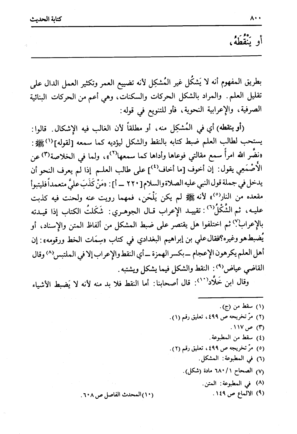 (أَو ينقطه) أَي فِي المُشكِل مِنْهُ، أَو مُطلقًا لِأَن الْغَالِب فِيهِ الْإِشْكَال. قَالُوا: يسْتَحبّ لطَالب الْعلم ضبط كِتَابه بالنقط والشكل ليؤديه كَمَا سَمعه [لقَوْله] [صلى الله عَلَيْهِ وَسلم] : " نَضَّر الله أمرأ سمع مَقَالَتي فوعاها وأداها كَمَا سَمعهَا "، وَلما فِي الْخُلَاصَة عَن الأصْمَعِي يَقُول: إِن أخوف [مَا أَخَاف] على طَالب الْعلم إِذا لم يعرف النَّحْو أَن يدْخل فِي جملَة قَول النَّبِي عَلَيْهِ الصَّلَاة وَالسَّلَام [220 - أ] : " مَنْ كَذَبَ عليّ مُتَعَمدا فَليَتَبَوَّأ " مَقْعَده من النَّار " لِأَنَّهُ [صلى الله عَلَيْهِ وَسلم] لم يكن يَلْحَن، فمهما رويت عَنهُ ولحنت فِيهِ كذبت عَلَيْهِ، ثمَّ الشَّكْلُ: تَقْيِيد الْإِعْرَاب قَالَ الْجَوْهَرِي: شَكَلتُ الْكتاب إِذا قيدته بالإعراب. ثمَّ اخْتلفُوا هَل يقْتَصر على ضبط الْمُشكل من أَلْفَاظ الْمَتْن والإسناد، أَو يُضبط هُوَ وَغَيره؟ فَقَالَ عَليّ بن إِبْرَاهِيم الْبَغْدَادِيّ فِي كتاب " سِمات الْخط ورقومه ": إِن أهل الْعلم يكْرهُونَ الإعجام - بِكَسْر الْهمزَة - أَي النقط وَالْإِعْرَاب إِلَّا فِي الملتبس وَقَالَ القَاضِي عِيَاض: النقط والشكل فِيمَا يشكل وَيشْتَبه.
