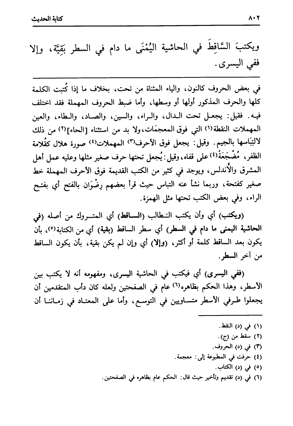 فِي بعض الْحُرُوف كالنون، وَالْيَاء الْمُثَنَّاة من تَحت، بِخِلَاف مَا إِذا كُتبت الْكَلِمَة كلهَا والحرف الْمَذْكُور أَولهَا أَو وَسطهَا، وَأما ضبط الْحُرُوف الْمُهْملَة فقد اخْتلف فِيهِ. فَقيل: يَجْعَل تَحت الدَّال، وَالرَّاء، وَالسِّين، وَالصَّاد، والطاء، وَالْعين المهملات النقطة الَّتِي فَوق المعجَمَات، وَلَا بُد من اسْتثِْنَاء [الْحَاء] من ذَلِك لالِتِبَاسها بِالْجِيم. وَقيل: يَجْعَل فَوق الأحرف المهملات صُورَة هِلَال كقُلامة الظفر، مُضْجَعَةً على قَفاهُ، وَقيل: يُجعل تحتهَا حرف صَغِير مثلهَا وَعَلِيهِ عمل أهل الْمشرق والأندلس، وَيُوجد فِي كثير من الْكتب الْقَدِيمَة فَوق الأحرف الْمُهْملَة خطّ صَغِير كفتحة، وَرُبمَا نَشأ عَنهُ التباس حَيْثُ قَرَأَ بَعضهم رِضْوَان بِالْفَتْح أَي بِفَتْح الرَّاء، وَفِي بعض الْكتب تحتهَا مثل الْهمزَة.