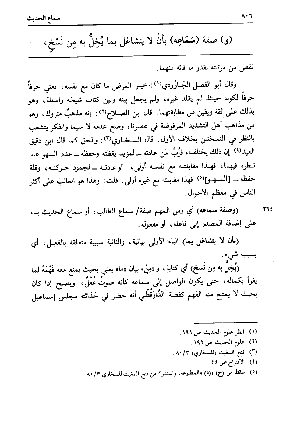 وَقَالَ أَبُو الْفضل الجَارُودي: خير الْعرض مَا كَانَ مَعَ نَفسه، يَعْنِي حرفا حرفا لكَونه حِينَئِذٍ لم يُقَلّد غَيره، وَلم يَجْعَل بَينه وَبَين كتاب شَيْخه وَاسِطَة، وَهُوَ بذلك على ثِقَة ويقين من مطابقتهما. قَالَ ابْن الصّلاح: إِنَّه مذهبٌ مَتْرُوك، وَهُوَ من مَذَاهِب أهل التَّشْدِيد المرفوضة فِي عصرنا، وَصَحَّ عَدمه لَا سِيمَا والفكر يتشعب بِالنّظرِ فِي النسختين بِخِلَاف الأول. قَالَ السخاوي: وَالْحق كَمَا قَالَ ابْن دَقِيق الْعِيد: إِن ذَلِك يخْتَلف، قُربّ مَن عَادَته - لمزيد يقظته وَحفظه - عدم السَّهْو عِنْد نظره فيهمَا، فَهَذَا مُقَابلَته مَعَ نَفسه أولى، أَو عَادَته - لجمود حركته، وَقلة حفظه -[السَّهْو] فَهَذَا مُقَابلَته مَعَ غَيره أولى. قلت: وَهَذَا هُوَ الْغَالِب على أَكثر النَّاس فِي مُعظم الْأَحْوَال.