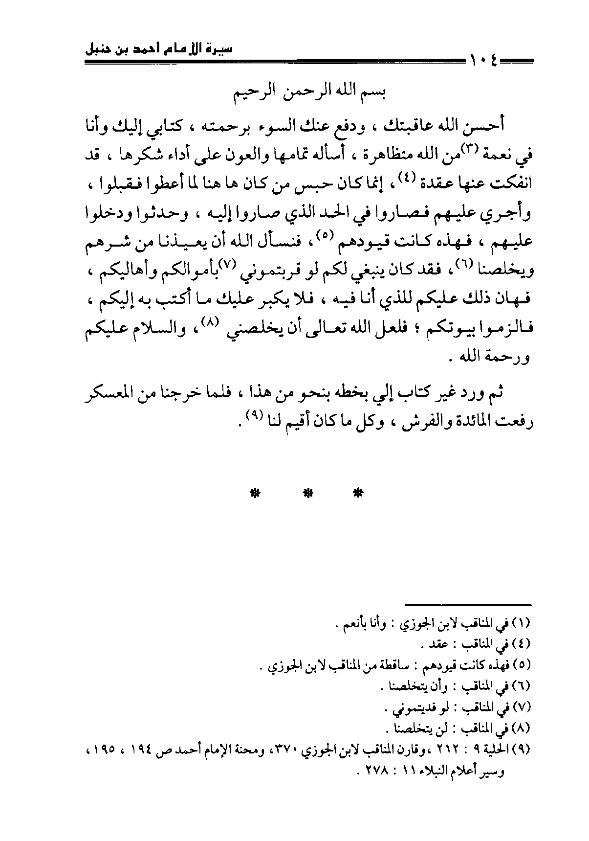 وَجعلت رسل المتَوَكل تَأتيه يسألونه عَن خَبره فيصيرون إِلَيْهِ وَيَقُولُونَ لَهُ هُوَ ضَعِيف وَفِي خلال ذَلِك يَقُولُونَ يَا أَبَا عبد الله لَا بُد من أَن يراك فيسكت فَإِذا خَرجُوا قَالَ إِلَّا تعجب من قَوْله لَا بُد من أَن يراك وَمَا عَلَيْهِم من أَن يراني _
