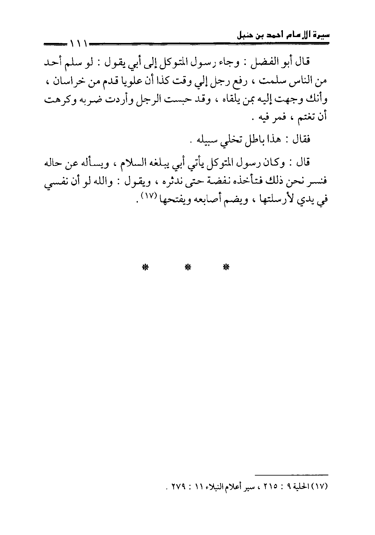 فَقدم علينا فِيمَا بَين الظّهْر وَالْعصر فَلَمَّا انحدر إِلَى بَغْدَاد وَمكث قَلِيلا قَالَ لي يَا صَالح قلت لبيْك قَالَ احب أَن تدع هَذَا الرزق فَلَا تَأْخُذهُ وَلَا توكل فِيهِ أحدا فقد علمت أَنكُمْ إِنَّمَا تأخذونه بسببي فَسكت