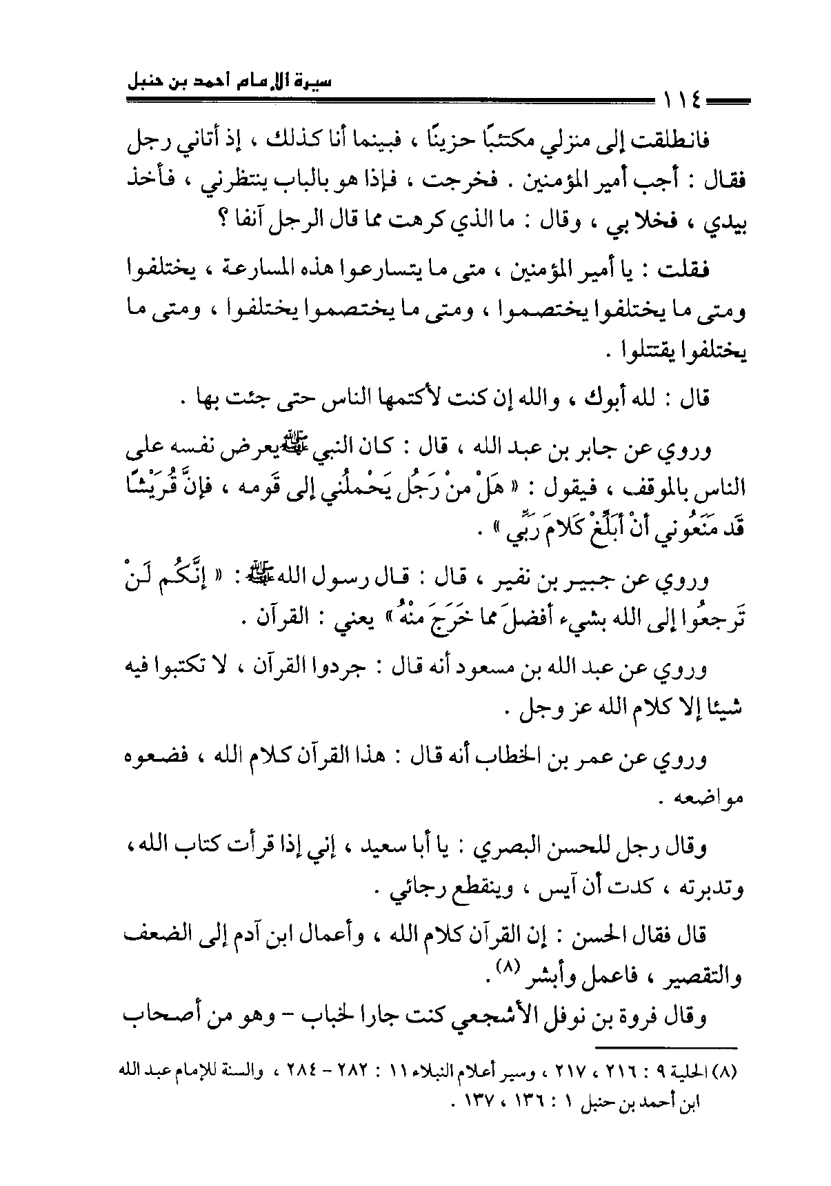 قَالَ أَبُو الْفضل ثمَّ كتب أبي رَحمَه الله إِلَى يحيى بن خاقَان يسْأَله ويعزم عَلَيْهِ أَن لَا يعيننا على شَيْء من أرزاقنا وَلَا يتَكَلَّم فِيهِ فبلغني فوجهت إِلَى الْقيم لنا وَهُوَ ابْن غَالب بن بنت مُعَاوِيَة بن عَمْرو وَقد كنت قلت لَهُ يَا أَبَت انه يكبر عَلَيْك وَقد عزمت إِذا حدث أَمر أَخْبَرتك بِهِ فَلَمَّا وصل رَسُوله بِالْكتاب إِلَى يحيى أَخذه من صَاحب الْخَبَر قَالَ فَأخذت نسخته ووصلت إِلَى المتَوَكل فَقَالَ لعبد الله كم من شهر لولد احْمَد بن حَنْبَل _