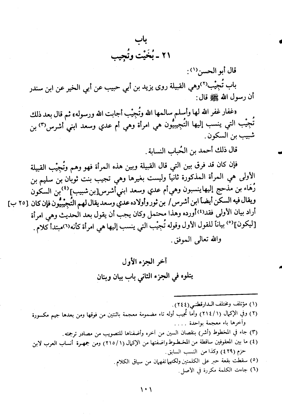 فَإِن كَانَ قد فرق بَين الَّتِي قَالَ الْقَبِيلَة وَبَين هَذِه الْمَرْأَة فَهُوَ وهم وتجيب الْقَبِيلَة الأولى هِيَ الْمَرْأَة الْمَذْكُورَة ثَانِيًا وَلَيْسَت بغَيْرهَا وَهِي تجيب بنت ثَوْبَان بن سليم بن رهاء بن مذْحج إِلَيْهَا ينسبون وَهِي أم عدي وَسعد ابْني أَشْرَس [بن شبيب] بن السّكُون وَيُقَال فِيهِ السكن أَيْضا ابْن أَشْرَس بن ثَوْر وَأَوْلَاده عدي وَسعد يُقَال لَهُم التجيبيون فَإِن كَانَ أَرَادَ بَيَان الأولى فقد أوردهُ وَهَذَا مُحْتَمل وَكَانَ يجب أَن يَقُول بعد الحَدِيث وَهِي امْرَأَة [ليَكُون] بَيَانا لِلْقَوْلِ الأول وَقَوله تجيب الَّتِي ينْسب إِلَيْهَا هِيَ امْرَأَة كَأَنَّهُ مُبْتَدأ كَلَام