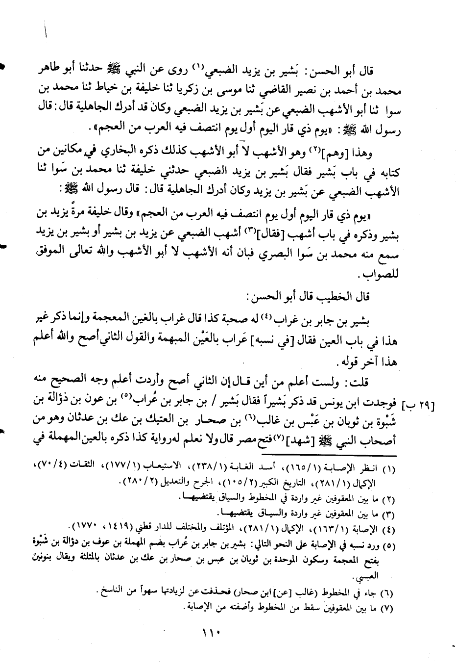 قلت وَلست أعلم من أَيْن قَالَ إِن الثَّانِي أصح وَأَرَدْت أعلم وَجه الصَّحِيح مِنْهُ [29 ب] فَوجدت ابْن يُونُس قد ذكر بشيرا فَقَالَ بشير بن جَابر بن عراب بن عون بن ذؤالة بن شبوة بن ثَوْبَان بن عبس بن غَالب بن صحار بن العتيك بن عك بن عدثان وَهُوَ من أَصْحَاب النَّبِي صلى الله عَلَيْهِ وَسلم [شهد] فتح مصر قَالَ وَلَا نعلم لَهُ رِوَايَة كَذَا ذكره بِالْعينِ الْمُهْملَة فِي