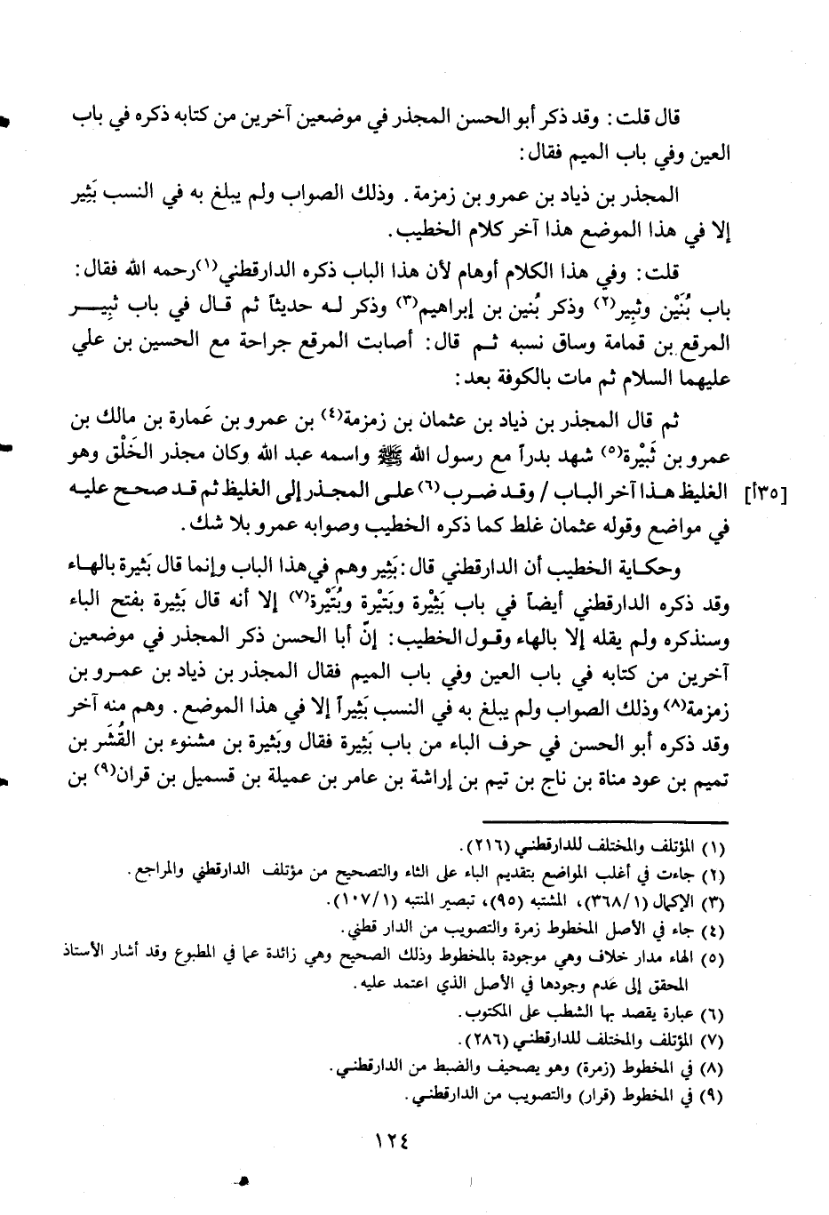وحكاية الْخَطِيب أَن الدَّارَقُطْنِيّ قَالَ بثير وهم فِي هَذَا الْبَاب وَإِنَّمَا قَالَ بثيرة بِالْهَاءِ وَقد ذكره الدَّارَقُطْنِيّ أَيْضا فِي بَاب بثيرة وبتيرة وبتيرة إِلَّا أَنه قَالَ بييرة بِفَتْح الْبَاء وسنذكره وَلم يقلهُ إِلَّا بِالْهَاءِ وَقَول الْخَطِيب إِن أَبَا الْحسن ذكر المجذر فِي موضِعين آخَرين من كِتَابه فِي بَاب الْعين وَفِي بَاب الْمِيم فَقَالَ المجذر بن ذياد بن عَمْرو بن زمزمة وَذَلِكَ الصَّوَاب وَلم يبلغ بِهِ من النّسَب بثيرا إِلَّا فِي هَذَا الْموضع وهم مِنْهُ آخر وَقد ذكره أَبُو الْحسن فِي حرف الْبَاء من بَاب بثيرة فَقَالَ وبثيرة بن مشنوء بن القشر بن تَمِيم بن عود مَنَاة بن نَاجٍ بن تيم بن اراشة بن عَامر بن عميلة بن قسميل بن قرَان بن