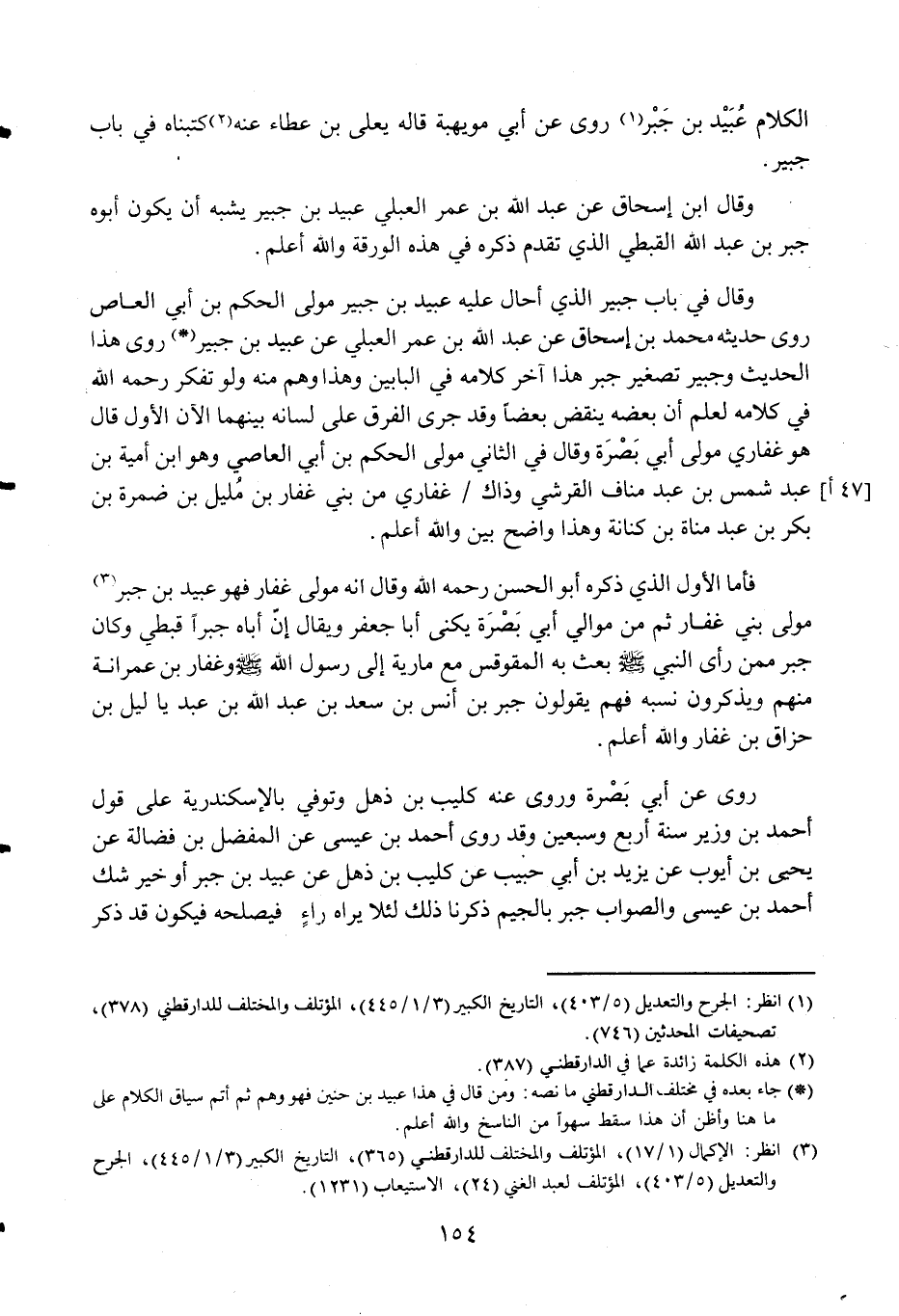 وَقَالَ فِي بَاب جُبَير الَّذِي أحَال عَلَيْهِ عبيد بن جُبَير مولى الحكم بن أبي الْعَاصِ روى حَدِيثه مُحَمَّد بن إِسْحَاق عَن عبد الله بن عمر العبلي عَن عبيد بن جُبَير روى هَذَا الحَدِيث وَجبير تَصْغِير جبر هَذَا آخر كَلَامه فِي الْبَابَيْنِ وَهَذَا وهم مِنْهُ وَلَو تفكر رَحمَه الله فِي كَلَامه لعلم أَن بعضه ينْقض بَعْضًا وَقد جرى الْفرق على لِسَانه بَينهمَا الْآن الأول قَالَ هُوَ غفاري مولى أبي بصرة وَقَالَ فِي الثَّانِي مولى الحكم بن أبي العَاصِي وَهُوَ ابْن أُميَّة بن عبد شمس بن عبد منَاف الْقرشِي وَذَاكَ غفاري من بني غفار بن مليل بن ضَمرَة بن بكر بن عبد مَنَاة بن كنَانَة وَهَذَا وَاضح بَين وَالله اعْلَم