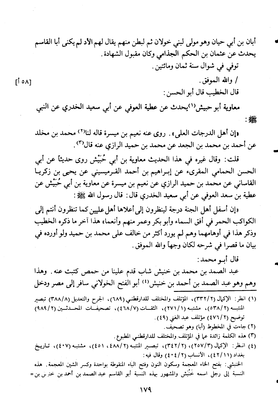 قلت وَقَالَ غَيره فِي هَذَا الحَدِيث مُعَاوِيَة بن أبي حُبَيْش روى حَدِيثا عَن أبي الْحسن الحمامي المقريء عَن ابراهيم بن أَحْمد القرميسيني عَن يحيى بن زَكَرِيَّا القاساني عَن مُحَمَّد بن حميد الرَّازِيّ عَن نعيم بن ميسرَة عَن مُعَاوِيَة بن أبي حُبَيْش عَن عَطِيَّة بن سعد الْعَوْفِيّ عَن أبي سعيد الْخُدْرِيّ قَالَ قَالَ رَسُول الله صلى الله عَلَيْهِ وَسلم