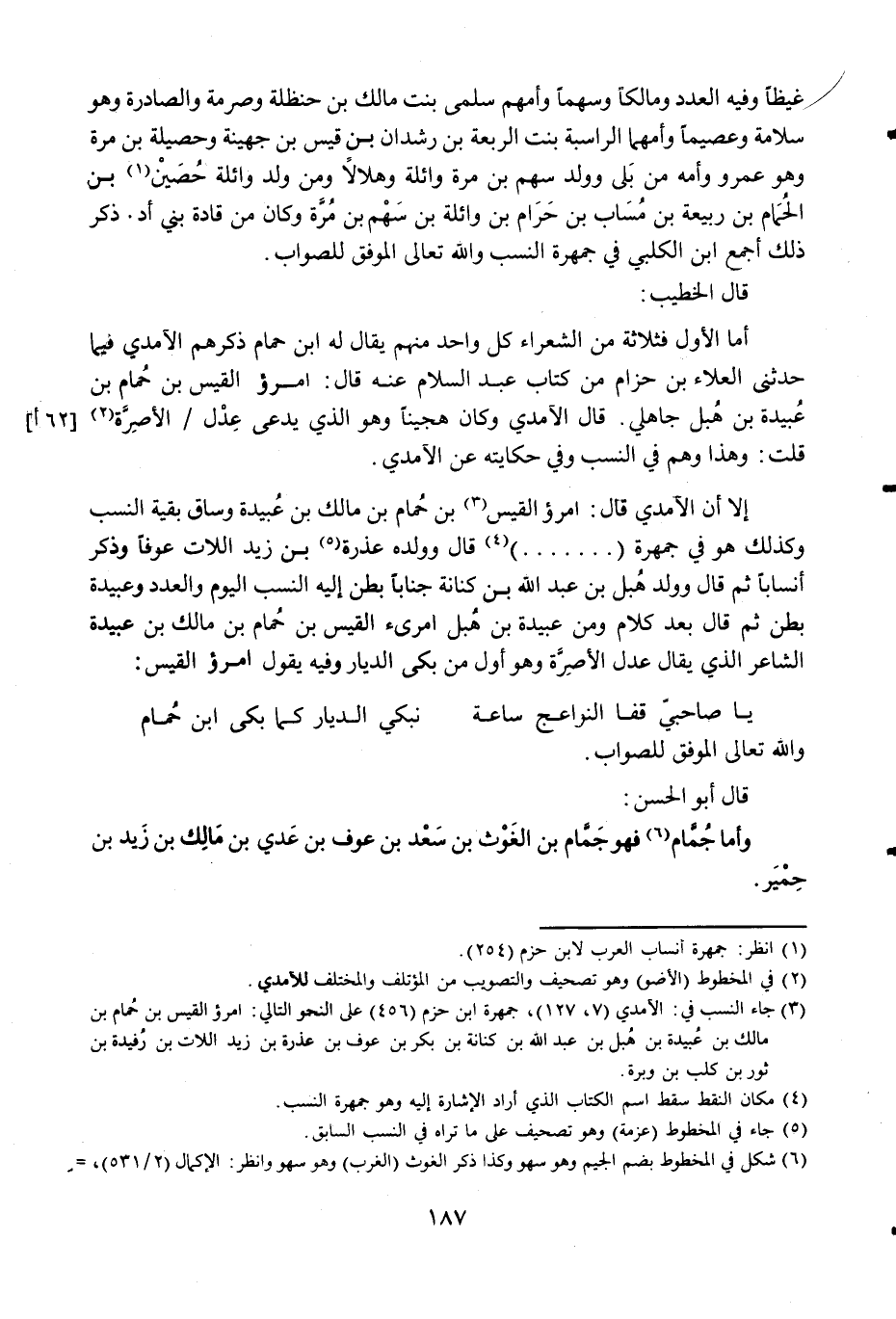 إِلَّا أَن الْآمِدِيّ قَالَ امْرُؤ الْقَيْس بن حمام بن مَالك بن عُبَيْدَة وسَاق بَقِيَّة النّسَب وَكَذَلِكَ هُوَ فِي جمهرة قَالَ وَولده عذرة بن زيد اللات عوفا وَذكر أنسابا ثمَّ قَالَ وَولد هُبل بن عبد الله بن كنَانَة جنابا بطن إِلَيْهِ النّسَب الْيَوْم وَالْعد وَعبيدَة بطن ثمَّ قَالَ بعد كَلَام وَمن عُبَيْدَة بن هُبل امريء الْقَيْس بن حمام بن مَالك بن عُبَيْدَة الشَّاعِر الَّذِي يُقَال عدل الأصرة وَهُوَ أول من بَكَى الديار وَفِيه يَقُول امْرُؤ الْقَيْس ... يَا صَاحِبي قفا النواعج سَاعَة ... نبكي الديار كَمَا بَكَى ابْن حمام ...