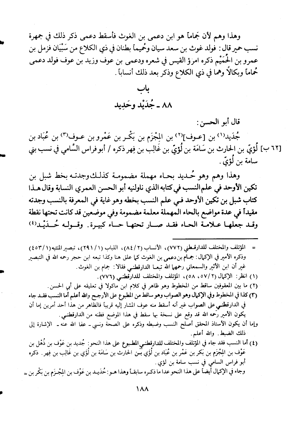 وَهَذَا وهم وَهُوَ حَدِيد بحاء مُهْملَة مَضْمُومَة كَذَلِك وجدته بِخَط شبْل بن تكين الأوحد فِي علم النّسَب فِي كِتَابه الَّذِي ناولنيه أَبُو الْحسن الْعمريّ النسابة وَقَالَ هَذَا كتاب شبْل بن تكين الأوحد فِي علم النّسَب بِخَطِّهِ وَهُوَ غَايَة فِي الْمعرفَة بِالنّسَبِ وجدته مُقَيّدا فِي عدَّة مَوَاضِع بِالْحَاء الْمُهْملَة معلمة مَضْمُومَة وَفِي موضِعين قد كَانَت تحتهَا نقطة وَقد جعلهَا عَلامَة الْحَاء فقد صَار تحتهَا حاء كَبِيرَة وَقَوله حَدِيد