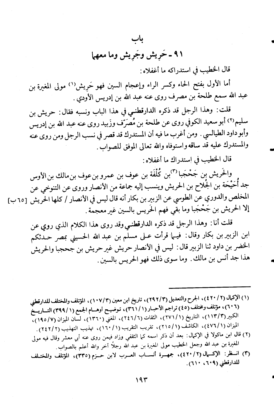أما الأول بِفَتْح الْحَاء وَكسر الرَّاء وإعجام السِّين فَهُوَ حريش مولى الْمُغيرَة بن عبد الله سمع طَلْحَة بن مصرف روى عَنهُ عبد الله بن إِدْرِيس الأودي