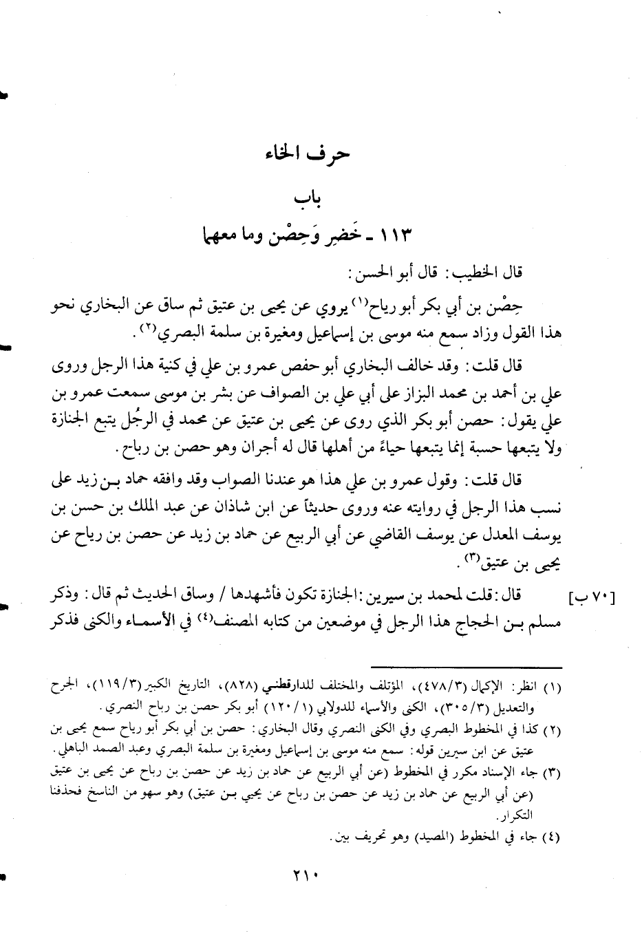 بقال قلت وَقد خَالف البُخَارِيّ أَبُو حَفْص عَمْرو بن عَليّ فِي كنية هَذَا الرجل وروى عَليّ بن أَحْمد بن مُحَمَّد الْبَزَّاز على أبي عَليّ بن الصَّواف عَن بشر بن مُوسَى سَمِعت عَمْرو بن عَليّ يَقُول حصن أَبُو بكر الَّذِي روى عَن يحيى بن عَتيق عَن مُحَمَّد فِي الرجل يتبع الْجِنَازَة وَلَا يتبعهَا حسبَة إِنَّمَا يتبعهَا حَيَاء من أَهلهَا قَالَ لَهُ أَجْرَانِ وَهُوَ حصن بن رَبَاح