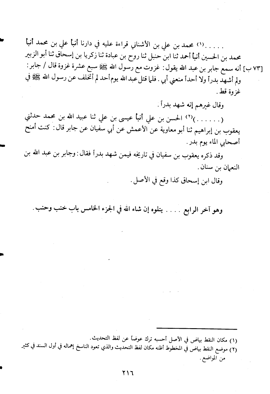 مُحَمَّد بن عَليّ بن الْأُشْنَانِي قِرَاءَة عَلَيْهِ فِي دَارنَا أنبأ عَليّ بن مُحَمَّد أنبأ مُحَمَّد بن الْحُسَيْن أنبأ أَحْمد ثَنَا ابْن حَنْبَل ثَنَا روح بن عبَادَة ثَنَا زَكَرِيَّا بن إِسْحَاق ثَنَا أَبُو الزبير أَنه سمع جَابر بن عبد الله يَقُول غزوت مَعَ رَسُول الله صلى الله عَلَيْهِ وَسلم سبع عشرَة غَزْوَة قَالَ جَابر وَلم أشهد بَدْرًا وَلَا أحدا مَنَعَنِي أبي فَلَمَّا قتل عبد الله يَوْم أحد لم أَتَخَلَّف عَن رَسُول الله صلى الله عَلَيْهِ وَسلم فِي غَزْوَة قطّ