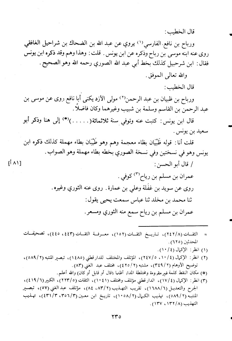 ورباح بن نَافِع الْفَارِسِي يروي عَن عبد الله بن الضَّحَّاك بن شرَاحِيل الغافقي روى عَنهُ ابْنه مُوسَى بن رَبَاح وَذكره عَن ابْن يُونُس قلت وَهَذَا وهم وَقد ذكره ابْن يُونُس فَقَالَ ابْن شُرَحْبِيل كَذَلِك بِخَط أبي عبد الله الصُّورِي رَحمَه الله وَهُوَ الصَّحِيح وَالله تَعَالَى الْمُوفق