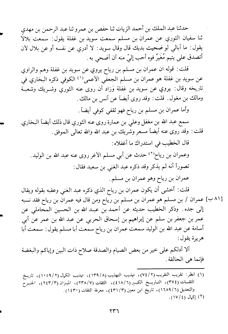 قلت أخْشَى أَن يكون عمرَان بن ريَاح الَّذِي ذكره عبد الْغَنِيّ وَعقبَة بقوله وَيُقَال عمرَان بن مُسلم هُوَ عمرَان بن مُسلم بن ريَاح وَمن قَالَه فِيهِ عمرَان بن ريَاح فقد نسبه إِلَى جده وَذكر الْخَطِيب حَدِيثه عَن أَحْمد بن عبد الله بن الْحُسَيْن الْمحَامِلِي عَن عمر بن جَعْفَر بن سلم عَن إِبْرَاهِيم بن إِسْحَاق الْحَرْبِيّ عَن عبد الله بن عمر عَن أبي أُسَامَة عَن عبد الله بن الْوَلِيد سَمِعت عمرَان بن ريَاح سَمِعت أَبَا مُسلم يَقُول سَمِعت أَبَا هُرَيْرَة يَقُول