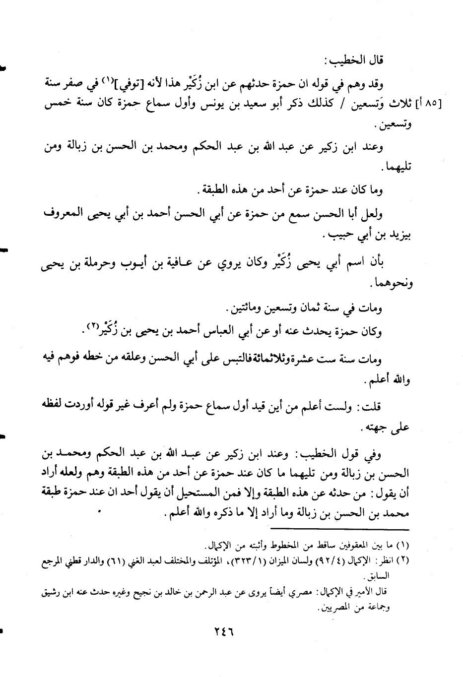 وَفِي قَول الْخَطِيب وَعند ابْن زُكَيْرٍ عَن عبد الله بن عبد الحكم وَمُحَمّد بن الْحسن بن زبالة من تليهما مَا كَانَ عِنْد حَمْزَة عَن أحد من هَذِه الطَّبَقَة وهم وَلَعَلَّه أَرَادَ أَن يَقُول من حَدثهُ عَن هَذِه الطَّبَقَة وَإِلَّا فَمن المستحيل أَن يَقُول أحد إِن عِنْد حَمْزَة طبقَة مُحَمَّد بن الْحسن بن زبالة وَمَا أَرَادَ إِلَّا مَا ذكره وَالله أعلم