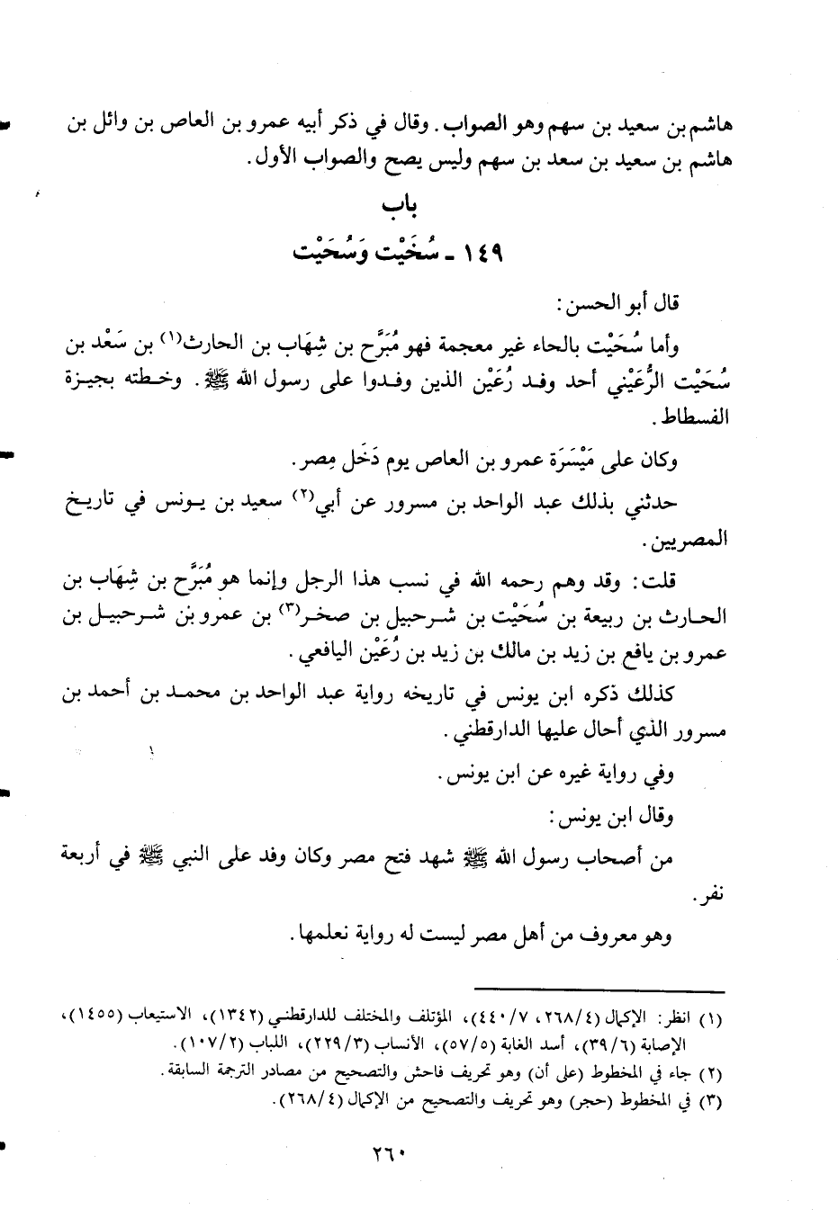 وَأما سحيت بِالْحَاء غير مُعْجمَة فَهُوَ مبرح بن شهَاب بن الْحَارِث بن سعد بن سحيت الرعيني أحد وَفد رعين الَّذِي وفدوا على رَسُول الله صلى الله عَلَيْهِ وَسلم وخطته بجيزة الْفسْطَاط