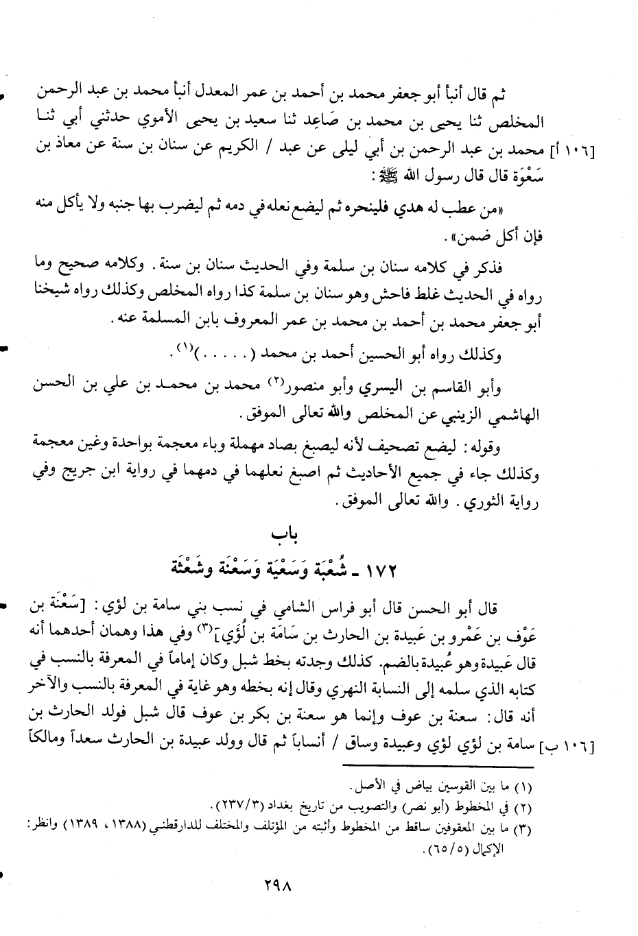 قَالَ أَبُو الْحسن قَالَ أَبُو فراس الشَّامي فِي نسب بني سامة بن لؤَي سعنة بن عَوْف بن عَمْرو بن عُبَيْدَة بن الْحَارِث بن سامة بن لؤَي وَفِي هَذَا وهمان أَحدهمَا أَنه قَالَ عُبَيْدَة وَهُوَ عُبَيْدَة بِالضَّمِّ كَذَلِك وجدته بِخَط شبْل وَكَانَ إِمَامًا فِي الْمعرفَة بِالنّسَبِ فِي كِتَابه الَّذِي سلمه إِلَى النسابة النَّهْرِي وَقَالَ إِنَّه بِخَطِّهِ وَهُوَ غَايَة فِي الْمعرفَة بِالنّسَبِ وَالْآخر أَنه قَالَ سعنة بن عَوْف وَإِنَّمَا هُوَ سعنة بن بكر بن عَوْف قَالَ شبْل فولد الْحَارِث بن سامه بن لؤَي وَعبيدَة وسَاق أنسابا ثمَّ قَالَ وَولد عُبَيْدَة بن الْحَارِث سَعْدا ومالكا
