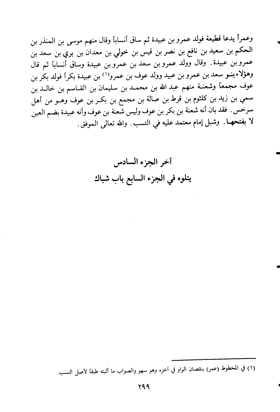 وعمرا يدعا قطيعة فولد عَمْرو بن عُبَيْدَة ثمَّ سَاق أنسابا وَقَالَ مِنْهُم مُوسَى بن الْمُنْذر بن الحكم بن سعيد بن نَافِع بن نصر بن قيس بن خولي بن معدان بن بري بن سعد بن عَمْرو بن عُبَيْدَة وَقَالَ وَولد عَمْرو بن سعد بن عَمْرو بن عُبَيْدَة وسَاق أنسابا ثمَّ قَالَ وَهَؤُلَاء بَنو سعد بن عَمْرو بن عبيد وَولد عَوْف بن عَمْرو بن عُبَيْدَة بكرا فولد بكر بن عَوْف مجمعا وسعنة مِنْهُم عبد الله بن مُحَمَّد بن سُلَيْمَان بن الْقَاسِم بن خَالِد بن سمي بن زيد بن كُلْثُوم بن قرط بن صالة بن مجمع بن بكر بن عَوْف وَأَنه عُبَيْدَة بِضَم الْعين لَا بِفَتْحِهَا وشبل إِمَام مُعْتَمد عَلَيْهِ فِي النّسَب وَالله تَعَالَى الْمُوفق