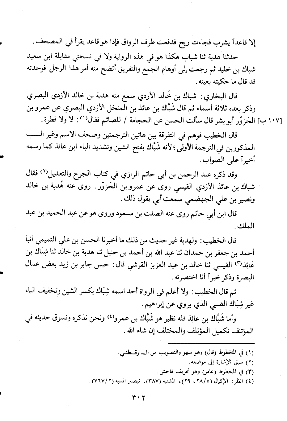 حَدثنَا هدبة ثَنَا شباب هَكَذَا هُوَ فِي الرِّوَايَة وَلَا فِي نُسْخَتي مُقَابلَة ابْن سعيد شباك بن خُلَيْد ثمَّ رجعت إِلَى أَوْهَام الْجمع والتفريق أتضح مِنْهُ أَمر مِنْهُ الرجل فَوَجَدته قد قَالَ مَا حكيته بِعَيْنِه