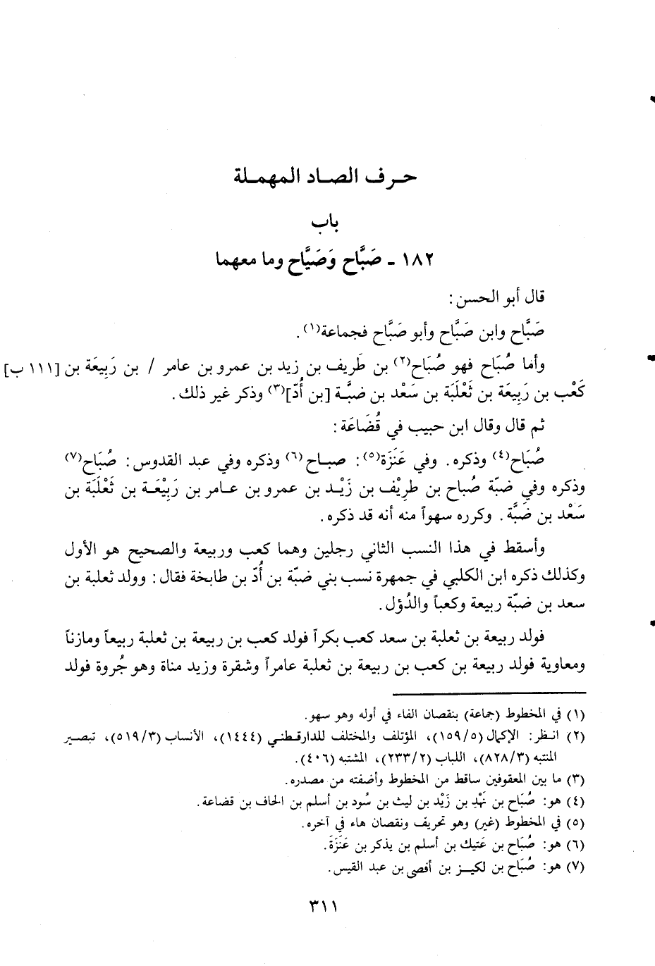 صباح وَذكره وَفِي عنزه صباح وَذكره وَفِي القدوس صباح وَذكره وَفِي ضبة صباح بن طريف بن زيد بن عَمْرو بن عَامر بن ربيعَة بن ثَعْلَبَة بن سعد بن ضبة وكرره سَهوا مِنْهُ أَنه قد ذكره