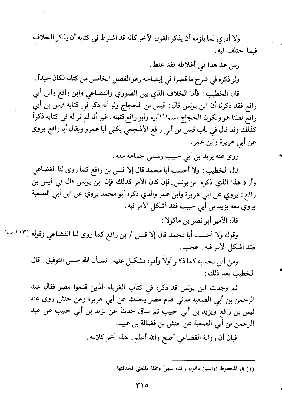 قَالَ الْخَطِيب فَأَما الْخلاف الَّذِي بَين الصُّورِي والقضاعي وَابْن رَافع وَابْن أبي رَافع فقد ذكرنَا أَن ابْن يُونُس قَالَ قيس بن الْحجَّاج وَلَو أَنه ذكر فِي كِتَابه قيس بن أبي رَافع لقلنا هُوَ وَيكون الْحجَّاج اسْم أَبِيه وَأَبُو رَافع كنيته غير أَنا لم نر لَهُ فِي كِتَابه ذكرا كَذَلِك وَقد قَالَ فِي بَاب قيس بن أبي رَافع الْأَشْجَعِيّ يكنى أَبَا عَمْرو وَيُقَال أَبَا رَافع يروي عَن أبي هُرَيْرَة وَابْن عمر