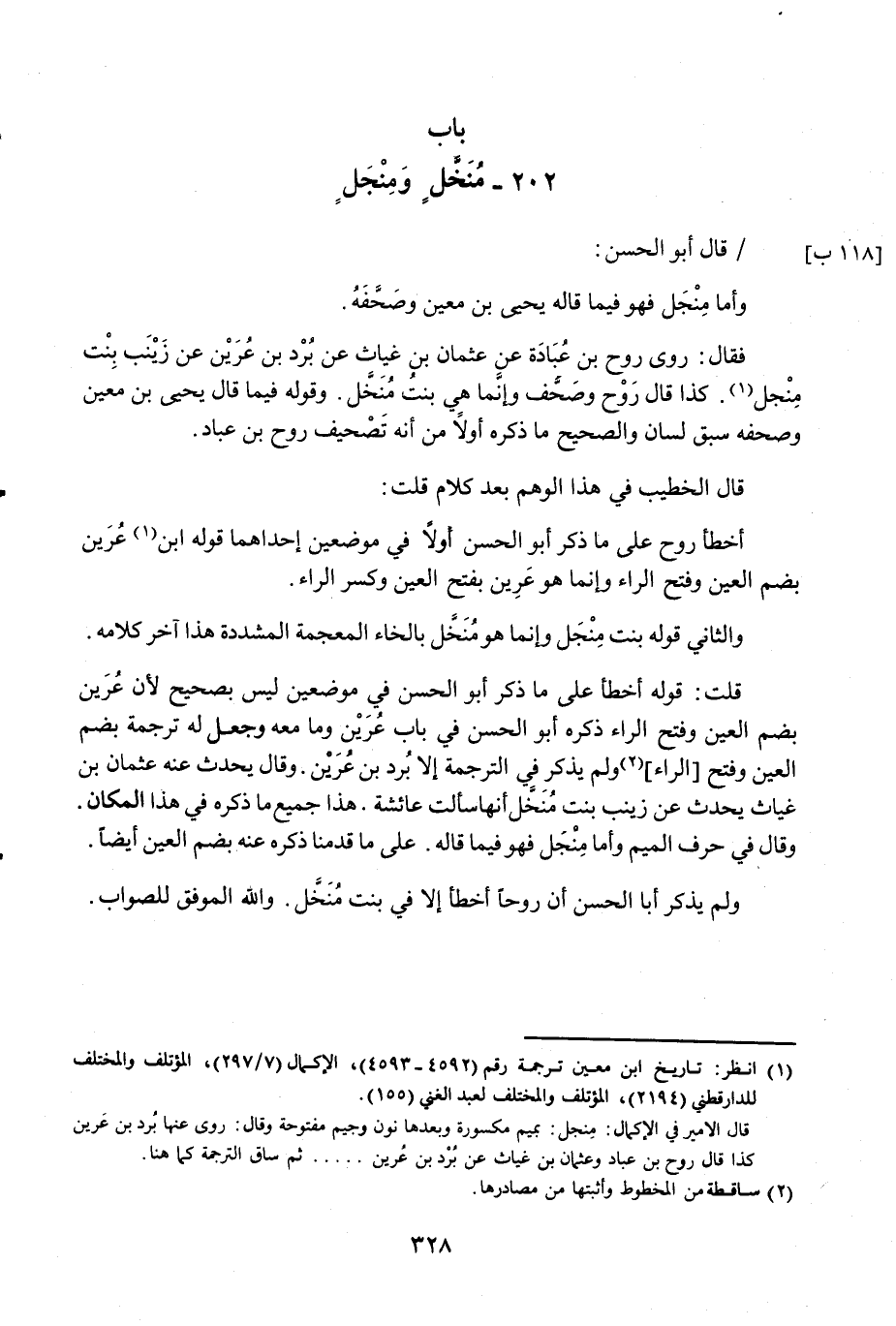 فَقَالَ روى روح بن عبَادَة عَن عُثْمَان بن غياث عَن برد عرين عَن زَيْنَب بنت منجل كَذَا قَالَ روح وصحف وَإِنَّمَا هِيَ بنت منخل وَقَوله فِيمَا قَالَ يحيى بن معِين وصحفة سبق لِسَان وَالصَّحِيح مَا ذكره أَولا من أَنه تَصْحِيف روح بن عباد