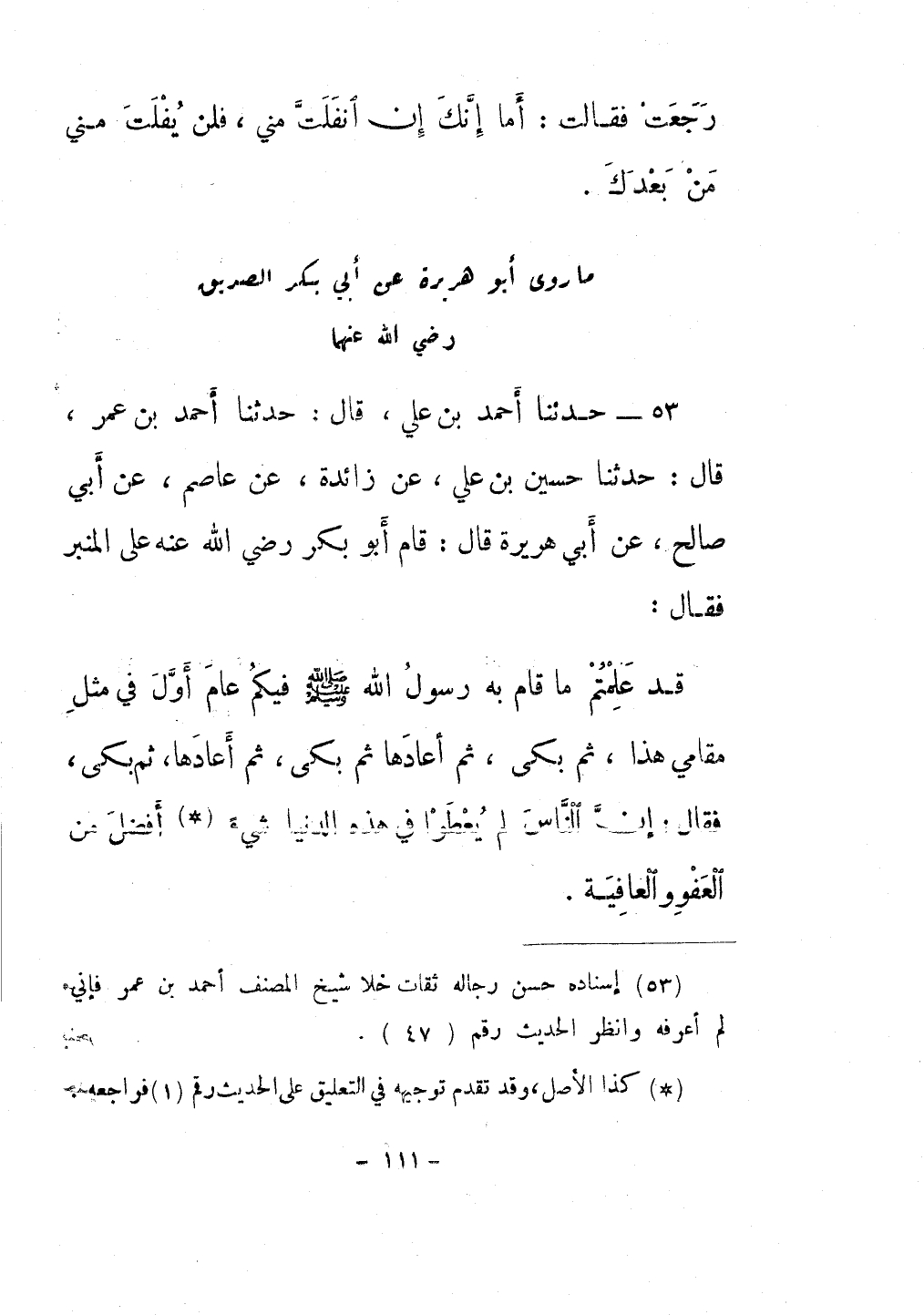 حَدَّثَنَا أَحْمَدُ بْنُ عَلِيٍّ قَالَ: حَدَّثَنَا أَحْمَدُ بْنُ عُمَرَ قَالَ: حَدَّثَنَا حُسَيْنُ بْنُ عَلِيٍّ , عَنْ زَائِدَةَ , عَنْ عَاصِمٍ , عَنْ أَبِي صَالِحٍ , عَنْ أَبِي هُرَيْرَةَ , قَالَ: " قَامَ أَبُو بَكْرٍ رَضِيَ اللَّهُ عَنْهُ عَلَى الْمِنْبَرِ فَقَالَ: قَدْ عَلِمْتُمْ مَا قَامَ بِهِ رَسُولُ اللَّهِ صَلَّى اللهُ عَلَيْهِ وَسَلَّمَ فِيكُمْ عَامَ أَوَّلٍ فِي مِثْلِ مَقَامِي هَذَا , ثُمَّ بَكَى , ثُمَّ أَعَادَهَا , ثُمَّ بَكَى , ثُمَّ أَعَادَهَا , ثُمَّ بَكَى , فَقَالَ: §إِنَّ النَّاسَ لَمْ يُعْطَوْا فِي هَذِهِ الدُّنْيَا شَيْئًا أَفْضَلَ مِنَ الْعَفْوِ وَالْعَافِيَةِ "