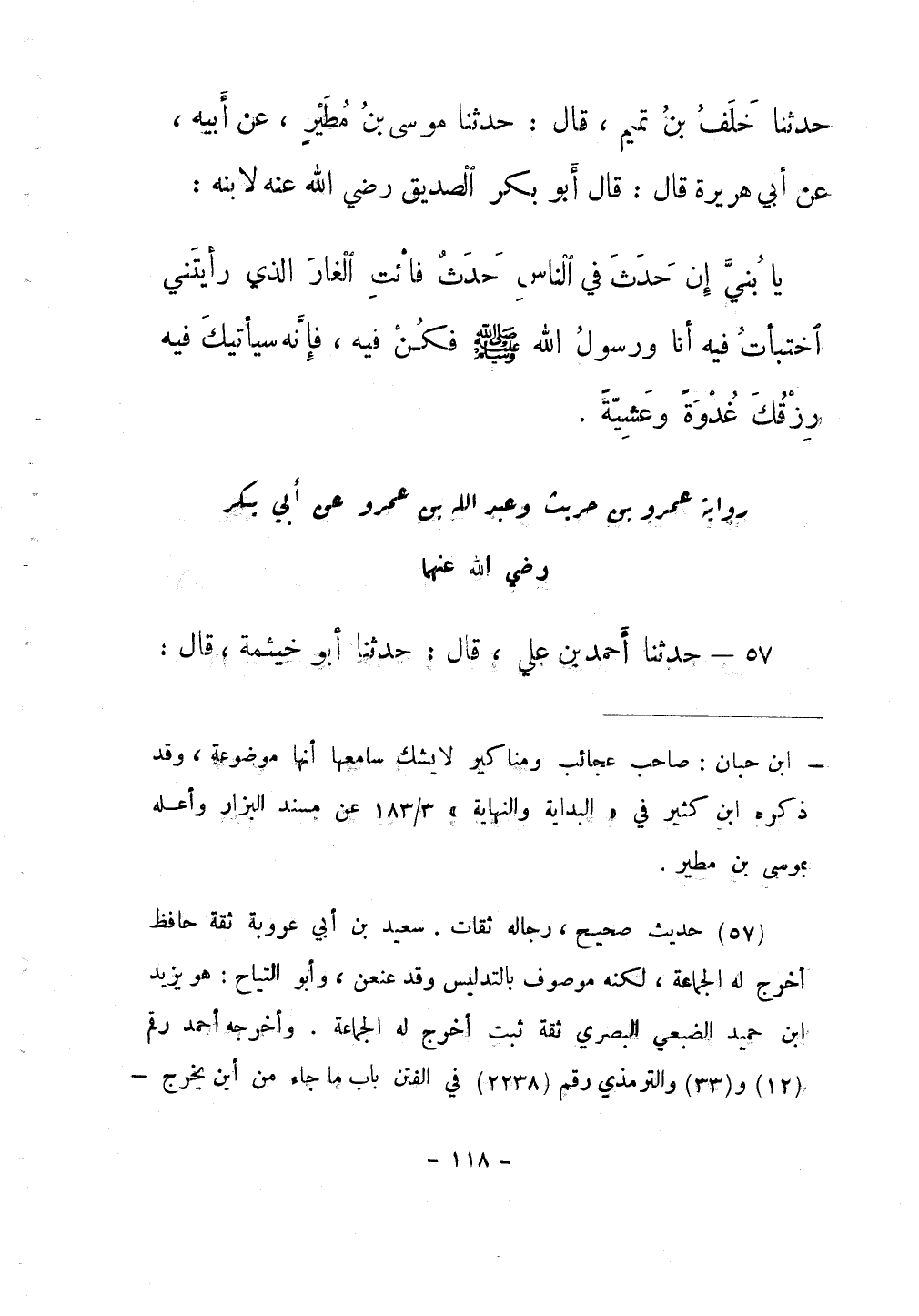 57 - حَدَّثَنَا أَحْمَدُ بْنُ عَلِيٍّ قَالَ: حَدَّثَنَا أَبُو خَيْثَمَةَ قَالَ: حَدَّثَنَا رَوْحُ بْنُ عُبَادَةَ قَالَ: حَدَّثَنَا سَعِيدُ بْنُ أَبِي عَرُوبَةَ , عَنْ أَبِي التَّيَّاحِ , عَنِ الْمُغِيرَةِ بْنِ سُبَيْعٍ , عَنْ عَمْرِو بْنِ حُرَيْثٍ , عَنْ أَبِي بَكْرٍ الصِّدِّيقِ , رَضِيَ اللَّهُ عَنْهُ قَالَ: حَدَّثَنَا رَسُولُ اللَّهِ صَلَّى اللهُ عَلَيْهِ وَسَلَّمَ: «إِنَّ §الدَّجَّالَ يَخْرُجُ مِنْ أَرْضٍ بِالْمَشْرِقِ يُقَالُ لَهَا خُرَاسَانُ , يَتْبَعُهُ أَقْوَامٌ كَأَنَّ وجُوهَهُمُ الْمَجَانُّ الْمُطْرَقَةُ»
