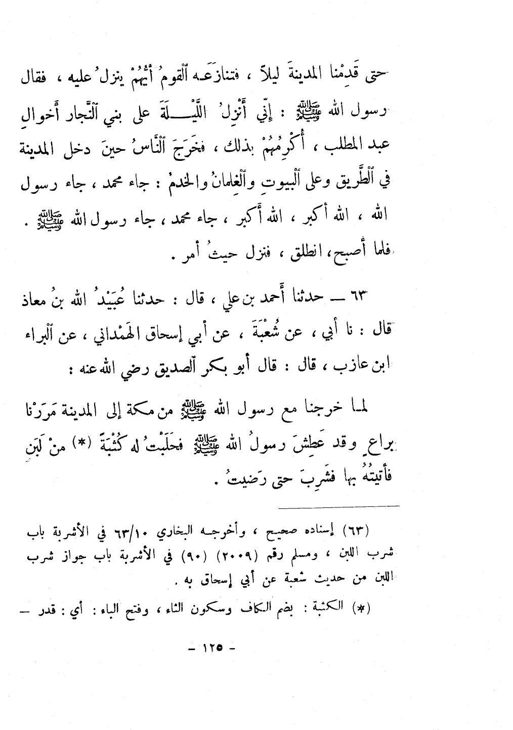 63 - حَدَّثَنَا أَحْمَدُ بْنُ عَلِيٍّ قَالَ: حَدَّثَنَا عُبَيْدُ اللَّهِ بْنُ مُعَاذٍ قَالَ: نَا أَبِي , عَنْ شُعْبَةَ , عَنْ أَبِي إِسْحَاقَ الْهَمْدَانِيِّ , عَنِ الْبَرَاءِ بْنِ عَازِبٍ قَالَ: قَالَ أَبُو بَكْرٍ الصِّدِّيقُ رَضِيَ اللَّهُ عَنْهُ: «لَمَّا خَرَجْنَا مَعَ رَسُولِ اللَّهِ صَلَّى اللهُ عَلَيْهِ وَسَلَّمَ مِنْ مَكَّةَ إِلَى الْمَدِينَةِ مَرَرْنَا بِرَاعٍ وَقَدْ عَطِشَ رَسُولُ اللَّهِ صَلَّى اللهُ عَلَيْهِ وَسَلَّمَ , فَحَلَبْتُ لَهُ كُثْبَةً مِنْ لَبَنٍ فَأَتَيْتُهُ بِهَا §فَشَرِبَ حَتَّى رَضِيتُ»