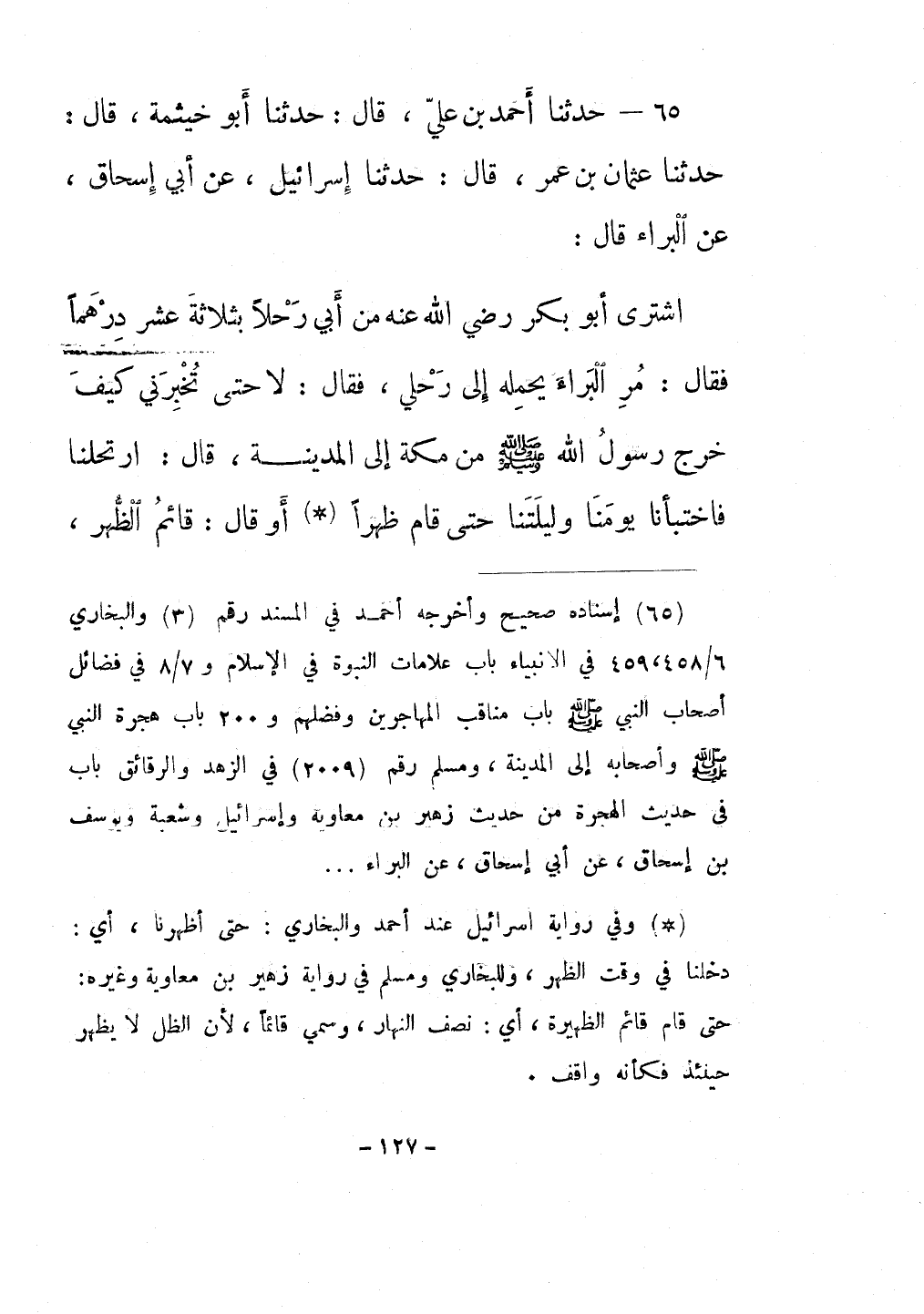 65 - حَدَّثَنَا أَحْمَدُ بْنُ عَلِيٍّ قَالَ: حَدَّثَنَا أَبُو خَيْثَمَةَ قَالَ: حَدَّثَنَا عُثْمَانُ بْنُ عُمَرَ قَالَ: حَدَّثَنَا إِسْرَائِيلُ , عَنْ أَبِي إِسْحَاقَ , عَنِ الْبَرَاءِ قَالَ: " اشْتَرَى أَبُو بَكْرٍ رَضِيَ اللَّهُ عَنْهُ مِنْ أَبِي رَحْلًا بِثَلَاثَةَ عَشَرَ دِرْهَمًا فَقَالَ: مُرِ الْبَرَاءَ يَحْمِلْهُ إِلَى رَحْلِي , فَقَالَ: لَا حَتَّى تُخْبِرَنِي كَيْفَ خَرَجَ رَسُولُ اللَّهِ صَلَّى اللهُ عَلَيْهِ وَسَلَّمَ مِنْ مَكَّةَ إِلَى الْمَدِينَةِ , قَالَ: ارْتَحَلْنَا فَاخْتَبَأْنَا يَوْمَنَا وَلَيْلَتَنَا حَتَّى قَامَ ظُهْرًا , أَوْ قَالَ: قَائِمٌ الظُّهْرَ -[128]- فَرَمَيْتُ بِبَصَرِي فَإِذَا أَنَا بِصَخْرَةٍ بِهَا بَقِيَّةٌ مِنْ ظِلٍّ فَسَوَّيْتُهُ وَفَرَشْتُ لِرَسُولِ اللَّهِ صَلَّى اللهُ عَلَيْهِ وَسَلَّمَ فِيهِ فَرْوَةً فَقُلْتُ: نَمْ يَا رَسُولَ اللَّهِ , ثُمَّ انْطَلَقْتُ اتَقَصَّى مَا حَوْلِي هَلْ أَتَى مِنَ الطَّلَبِ أَحَدٌ , فَإِذَا أَنَا بِرَاعِي غَنَمٍ يُرِيدُ مِنَ الصَّخْرَةِ مِثْلَمَا أَرَدْتُ , فَقُلْتُ: لِمَنْ أَنْتَ يَا غُلَامُ؟ فَقَالَ لِرَجُلٍ مِنْ قُرَيْشٍ , فَعَرَفْتُهُ فَقُلْتُ: هَلْ فِي غَنَمِكَ مِنْ لَبَنٍ؟ قَالَ: نَعَمْ فَقُلْتُ: هَلْ أَنْتَ حَالِبٌ لَنَا؟ قَالَ: نَعَمْ , فَأَمَرْتُهُ فَاعْتَقَلَ شَاةً مِنَ الْغَنَمِ , ثُمَّ أَمَرْتُهُ بِنَفْضِ ضَرْعِهَا , ثُمَّ أَمَرْتُهُ بِنَفْضِ كَفَّيْهِ مِنَ الْغُبَارِ , فَحَلَبَ لِي كُثْبَةً مِنْ -[129]- لَبَنٍ وَمَعِي إِدَاوَةٌ عَلَى فَمِهَا خِرْقَةٌ , فَصَبَبْتُ الْمَاءَ عَلَى اللَّبَنِ حَتَّى بَرَدَ أَسْفَلُهُ , ثُمَّ أَتَيْتُ بِهِ رَسُولَ اللَّهِ صَلَّى اللهُ عَلَيْهِ وَسَلَّمَ فَوَافَقْتُهُ قَدِ اسْتَقْيَظَ , فَقُلْتُ: اشْرَبْ يَا رَسُولَ اللَّهِ , فَشَرِبَ حَتَّى رَضِيتُ ثُمَّ قُلْتُ: قَدْ آنَ الرَّحِيلُ يَا رَسُولَ اللَّهِ فَارْتَحَلْنَا , فَلَمْ يَلْحَقْنَا مِنَ الطَّلَبِ أَحَدٌ غَيْرُ سُرَاقَةَ بْنِ جُعْشُمٍ عَلَى فَرَسٍ لَهُ , فَقُلْتُ: هَذَا الطَّلَبُ قَدْ لَحِقَنَا يَا رَسُولَ اللَّهِ فَقَالَ: {" §لَا تَحْزَنْ إِنَّ اللَّهَ مَعَنَا} [التوبة: 40] " , فَلَمَّا دَنَا دَعَا عَلَيْهِ رَسُولُ اللَّهِ صَلَّى اللهُ عَلَيْهِ وَسَلَّمَ فَسَاخَ فَرَسُهُ فِي الْأَرْضِ إِلَى بَطْنِهِ , فَوَثَبَ عَنْهُ وَقَالَ: يَا مُحَمَّدُ قَدْ عَلِمْتُ أَنَّ هَذَا عَمَلُكَ فَادْعُ اللَّهَ أَنْ يُخَلِّصَنِيَ مِمَّا أَنَا فِيهِ وَلَكَ عَلَيَّ لَأُعَمِّيَنَّ عَلَى مَنْ وَرَائِي , وَهَذِهِ كِنَانَتِي فَخُذْ سَهْمًا مِنْهَا فَإِنَّكَ سَتَمُرُّ عَلَى إِبِلِي وَغِلْمَانِي بِمَكَانِ كَذَا وَكَذَا فَخُذْ مِنْهَا حَاجَتَكَ , قَالَ: لَا حَاجَةَ لِي فِي إِبِلِكَ فَقَدِمْنَا الْمَدِينَةَ لَيْلًا فَتَنَازَعُوهُ , أَيُّهُمْ يَنْزِلُ عَلَيْهِ , فَقَالَ أَنْزِلُ عَلَى بَنِي النَّجَّارِ أَخْوَالِ عَبْدِ الْمُطَّلِبِ أُكْرِمُهُمْ بِذَلِكَ , فَصَعِدَ الرِّجَالُ وَالنِّسَاءُ فَوْقَ الْبُيُوتِ وَتَفَرَّقَ الْغِلْمَانُ وَالْخَدَمُ فِي الطَّرِيقِ يُنَادُونَ: يَا مُحَمَّدُ , يَا رَسُولَ اللَّهِ , يَا مُحَمَّدُ , يَا رَسُولَ اللَّهِ