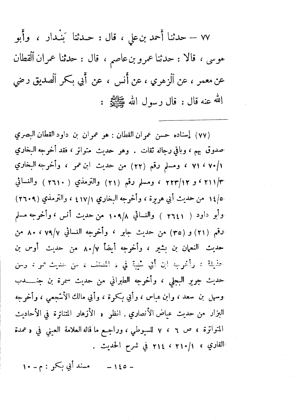77 - حَدَّثَنَا أَحْمَدُ بْنُ عَلِيٍّ قَالَ: حَدَّثَنَا بُنْدَارٌ , وَأَبُومُوسَى قَالَا: حَدَّثَنَا عَمْرُو بْنُ عَاصِمٍ قَالَ: حَدَّثَنَا عِمْرَانُ الْقَطَّانُ , عَنْ مَعْمَرٍ , عَنِ الزُّهْرِيِّ , عَنْ أَنَسٍ , عَنْ أَبِي بَكْرٍ الصِّدِّيقِ رَضِيَ اللَّهُ عَنْهُ قَالَ: قَالَ رَسُولُ اللَّهِ صَلَّى اللهُ عَلَيْهِ وَسَلَّمَ: " §أُمِرْتُ أَنْ أُقَاتِلَ النَّاسَ حَتَّى يَقُولُوا: لَا إِلَهَ إِلَّا اللَّهُ , فَإِذَا قَالُوهَا عَصَمُوا مِنِّي دِمَاءَهُمْ وَأَمْوَالَهُمْ إِلَّا بِحَقِّهَا وَحِسَابُهُمْ عَلَى اللَّهِ "