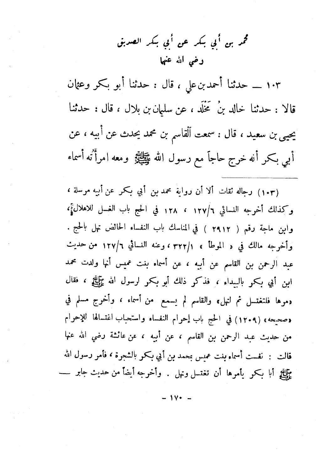 103 - حَدَّثَنَا أَحْمَدُ بْنُ عَلِيٍّ قَالَ: حَدَّثَنَا أَبُو بَكْرٍ , وَعُثْمَانُ قَالَا: حَدَّثَنَا خَالِدُ بْنُ مَخْلَدٍ , عَنْ سُلَيْمَانَ بْنِ بِلَالٍ , قَالَ: حَدَّثَنَا يَحْيَى بْنُ سَعِيدٍ , قَالَ: سَمِعْتُ الْقَاسِمَ بْنَ مُحَمَّدٍ , يُحَدِّثُ عَنْ أَبِيهِ , عَنْ أَبِي بَكْرٍ أَنَّهُ خَرَجَ حَاجًّا مَعَ رَسُولِ اللَّهِ صَلَّى اللهُ عَلَيْهِ وَسَلَّمَ وَمَعَهُ امْرَأَتُهُ أَسْمَاءُ ابْنَةُ عُمَيْسٍ , فَوَلَدَتْ بِالشَّجَرَةِ مُحَمَّدَ بْنَ أَبِي بَكْرٍ , فَأَتَى أَبُو بَكْرٍ رَضِيَ اللَّهُ عَنْهُ النَّبِيَّ صَلَّى اللهُ عَلَيْهِ وَسَلَّمَ فَأَخْبَرَهُ , «فَأَمَرَهُ رَسُولُ اللَّهِ صَلَّى اللهُ عَلَيْهِ وَسَلَّمَ §أَنْ يَأْمُرَهَا أَنْ تَغْتَسِلَ ثُمَّ تُهِلَّ بِالْحَجِّ وَتَصْنَعَ مَا يَصْنَعُ النَّاسُ إِلَّا أَنَّهَا لَا تَطُوفُ بِالْبَيْتِ»