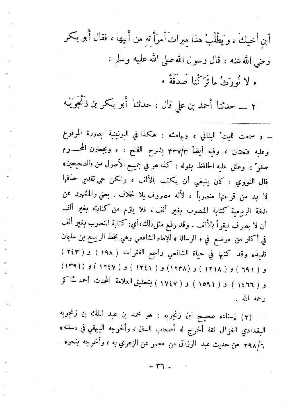 2 - حَدَّثَنَا أَحْمَدُ بْنُ عَلِيٍّ قَالَ: حَدَّثَنَا أَبُو بَكْرِ بْنُ زَنْجَوَيْهِ -[37]- قَالَ: حَدَّثَنَا عَبْدُ الرَّزَّاقِ , عَنْ مَعْمَرٍ , عَنِ الزُّهْرِيِّ , عَنْ مَالِكِ بْنِ أَوْسٍ الْحَدَثَانِ قَالَ: أَرْسَلَ إِلِيَّ عُمَرُ بْنُ الْخَطَّابِ رَضِيَ اللَّهُ عَنْهُ فَقَالَ: إِنَّهُ قَدْ حَضَرَ بِالْمَدِينَةِ أَهْلُ أَبْيَاتٍ مِنْ قَوْمِكَ , وَأَنَا قَدْ أَمَرْتُ لَهُمْ بِرَضْخٍ فَاقْسِمْهُ بَيْنَهُمْ , فَقُلْتُ: يَا أَمِيرَ الْمُؤْمِنِينَ مُرْ بِذَلِكَ غَيْرِي , فَقَالَ لَهُ: اقْبِضْهُ أَيُّهَا الرَّجُلُ قَالَ: فَبَيْنَا أَنَا كَذَلِكُ إِذْ جَاءَ مَوْلَاهُ يرْفَأُ -[38]- قَالَ: هَذَا عُثْمَانُ , وَعَبْدُ الرَّحْمَنِ بْنُ عَوْفٍ , وسَعْدٌ , وَالزُّبَيْرُ وَلَا أَدْرِي ذَكَرَ طَلْحَةَ أَمْ لَا , يسْتَأْذِنُونَ عَلَيْكَ , فَقَالَ: ائْذَنْ لَهُمْ , قَالَ: ثُمَّ مَكَثَ سَاعَةً , قَالَ: ثُمَّ جَاءَ فَقَالَ: هَذَا الْعَبَّاسُ وَعَلِيٌّ رَضِيَ اللَّهُ عَنْهُمَا يسْتَأْذِنَانِ عَلَيْكَ , فَقَالَ: ائْذَنْ لَهُمَا فَلَمَّا دَخَلَ الْعَبَّاسُ قَالَ: يَا أَمِيرَ الْمُؤْمِنِينَ اقْضِ بَيْنِي وبَيْنَ هَذَا , وَهُمَا حِينَئِذٍ يخْتَصِمَانِ فِيمَا أَفَاءَ اللَّهُ عَلَى رَسُولِهِ مِنْ أَمْوالِ بَنِي النَّضِيرِ , فَقَالَ الْقَوْمُ: اقْضِ بَيْنَهُمَا يَا أَمِيرَ الْمُؤْمِنِينَ , وَأَرِحْ كُلَّ وَاحِدٍ مِنْهُمَا مِنْ صَاحِبِهِ فَقَدْ طَالَتْ خُصُومَتُهُمَا , فَقَالَ عُمَرُ رَضِيَ اللَّهُ عَنْهُ: أَنْشُدُكُمُ اللَّهَ الَّذِي بِإِذْنِهِ تَقُومُ السَّمَاءُ وَالْأَرْضُ أَتَعْلَمُونَ أَنَّ رَسُولَ اللَّهِ صَلَّى اللهُ عَلَيْهِ وَسَلَّمَ قَالَ: «§لَا نُورَثُ مَا تَرَكْنَا صَدَقَةٌ» ؟ قَالُوا: قَدْ قَالَ ذَلِكَ , ثُمَّ قَالَ لَهُمَا مِثْلَ ذَلِكَ , قَالَ: فَإِنِّي أُخْبِرُكُمْ عَنْ هَذَا الْفَيْءِ , إِنَّ اللَّهَ تَبَارَكَ وَتَعَالَى خَصَّ نَبِيَّهُ صَلَّى اللهُ عَلَيْهِ وَسَلَّمَ بِشَيْءٍ لَمْ يُعْطِهِ غَيْرَهُ , قَالَ: {وَمَا أَفَاءَ اللَّهُ عَلَى رَسُولِهِ مِنْهُمْ فَمَا أَوْجَفْتُمْ عَلَيْهِ مِنْ خَيْلِ وَلَا رِكَابٍ} [الحشر: 6] فَكَانَتْ هَذِهِ لِرَسُولِ اللَّهِ صَلَّى اللهُ عَلَيْهِ وَسَلَّمَ -[39]- خَاصَّةً ثُمَّ وَاللَّهِ مَا أَجَازَهَا دُونَكُمْ , وَلَا أَسْتَأْثَرُ بِهَا عَلَيْكُمْ , لَقَدْ قَسَمَهَا بَيْنَكُمْ , وبَثَّهَا فِيكُمْ , حَتَّى بَقِيَ مِنْهَا هَذَا الْمَالُ , وَكَانَ يُنْفِقُ عَلَى أَهْلِهِ مِنْهُ سَنَةً , ورُبَّمَا قَالَ مَعْمَرٌ: قُوتُ أَهْلِهِ سَنَةً , ثُمَّ يجْعَلُ مَا بَقِيَ مِنْهُ مَجْعَلَ مَالِ اللَّهِ , فَلَمَّا قُبِضَ رَسُولُ اللَّهِ صَلَّى اللهُ عَلَيْهِ وَسَلَّمَ قَالَ: أَبُو بَكْرٍ: أَنَا وَلِيُّ رَسُولِ اللَّهِ صَلَّى اللهُ عَلَيْهِ وَسَلَّمَ بَعْدَهُ , فَأَعْمَلُ فِيهَا مَا كَانَ رَسُولُ اللَّهِ صَلَّى اللهُ عَلَيْهِ وَسَلَّمَ يَعْمَلُ فِيهَا , ثُمَّ أَقْبَلَ عَلَى , عَلِيٍّ , وَالْعَبَّاسِ فَقَالَ: وَأَنْتُمَا تَزْعُمَانِ أَنَّهُ فِيهَا , وَاللَّهُ يعْلَمُ أَنَّهُ فِيهَا صَادِقٌ بَارٌّ , تَابِعٌ لِلْحَقِّ , ثُمَّ وُلِّيتُهَا بَعْدَ أَبِي بَكْرٍ سَنَتَيْنِ مِنْ إِمَارَتِي , فَعَمِلْتُ فِيهَا بِمَا عَمِلَ رَسُولُ اللَّهِ صَلَّى اللهُ عَلَيْهِ وَسَلَّمَ وَأَبُو بَكْرٍ , وَأَنْتُمَا تَزْعُمَانِ أَنِّي فِيهَا. . . . وَاللَّهُ يعْلَمُ أَنِّي صَادِقٌ , وَبَارٌّ , مُتَابِعٌ لِلْحَقِّ ثُمَّ جِئْتُمَانِي , جَاءَ هَذَا يَعْنِي الْعَبَّاسَ يسْأَلُنِي عَنْ مِيرَاثِهِ مِنَ ابْنِ أَخِيهِ , وجَاءَ هَذَا يَعْنِي عَلِيًّا يسْأَلُنِي مِيرَاثَ امْرَأَتِهِ مِنْ أَبِيهَا , فَقُلْتُ لَكُمَا: سَمِعْتُ رَسُولَ اللَّهِ صَلَّى اللهُ عَلَيْهِ وَسَلَّمَ يَقُولُ: «لَا نُورَثُ , مَا تَرَكْنَا صَدَقَةٌ» -[40]- ثُمَّ بَدَا لِي 