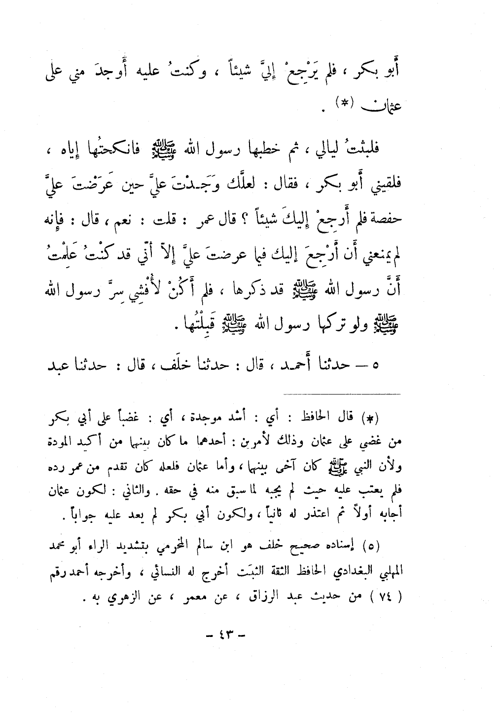 5 - حَدَّثَنَا أَحْمَدُ بْنُ عَلِيٍّ قَالَ: حَدَّثَنَا خَلَفٌ , قَالَ: حَدَّثَنَا عَبْدُ -[44]- الرَّزَّاقِ قَالَ: أَرنَا مَعْمَرٌ , عَنِ الزُّهْرِيِّ , عَنْ سَالِمٍ , عَنْ أَبِيهِ , عَنْ عُمَرَ قَالَ: تَأَيَّمَتْ حَفْصَةُ ابْنَةُ عُمَرَ مِنْ خُنَيْسِ بْنِ حُذَافَةَ أَوْ حُذَيْفَةَ - شَكَّ أَبُو بَكْرٍ - مِنْ أَصْحَابِ النَّبِيِّ صَلَّى اللهُ عَلَيْهِ وَسَلَّمَ , مِمَّنْ شَهِدَ بَدْرًا , فَتُوُفِّيَ بِالْمَدِينَةِ قَالَ: فَلَقِيتُ عُثْمَانَ بْنَ عَفَّانَ رَضِيَ اللَّهُ عَنْهُ فَعَرَضْتُ عَلَيْهِ حَفْصَةَ فَقُلْتُ: إِنْ شِئْتَ أَنْكَحْتُكَ حَفْصَةَ ابْنَةَ عُمَرَ , فَقَالَ: سَأَنْظُرُ فِي ذَلِكَ , فَلَبِثْتُ لَيَالِيَ , فَلَقِيَنِي فَقَالَ: مَا أُرِيدُ أَنْ أَتَزَوَّجَ يَوْمِي هَذَا , قَالَ عُمَرُ: فَلَقِيتُ أَبَا بَكْرٍ رَضِيَ اللَّهُ عَنْهُ فَقُلْتُ: إِنْ شِئْتَ أَنْكَحْتُكَ حَفْصَةَ ابْنَةَ عُمَرَ , فَلَمْ يُرْجِعْ إِلَيَّ شَيْئًا , وَكُنْتُ أَوْجَدَ عَلَيْهِ مِنِّي عَلَى عُثْمَانَ , فَلَبِثْتُ لَيَالِيَ , «§فَخَطَبَهَا رَسُولُ اللَّهِ صَلَّى اللهُ عَلَيْهِ وَسَلَّمَ» فَأَنْكَحْتُهَا إِيَّاهُ , فَلَقِيَنِي أَبُو بَكْرٍ فَقَالَ: لَعَلَّكَ وَجَدْتَ عَلَيَّ حِينَ عَرَضْتَ عَلَيَّ حَفْصَةَ فَلَمْ أَرْجِعْ إِلَيْكَ شَيْئًا , -[45]- قَالَ: نَعَمْ , قَالَ: فَإِنَّهُ لَمْ يَمْنَعْنِي أَنْ أَرْجِعَ إِلَيْكَ حِينَ عَرَضْتَ عَلَيَّ إِلَّا أَنِّي سَمِعْتُ «رَسُولَ اللَّهِ صَلَّى اللهُ عَلَيْهِ وَسَلَّمَ يَذْكُرُهَا» , وَلَمْ أَكُنْ لِأُفْشِيَ سِرَّ رَسُولِ اللَّهِ صَلَّى اللهُ عَلَيْهِ وَسَلَّمَ , وَلَوْ تَرَكَهَا نَكَحْتُهَا