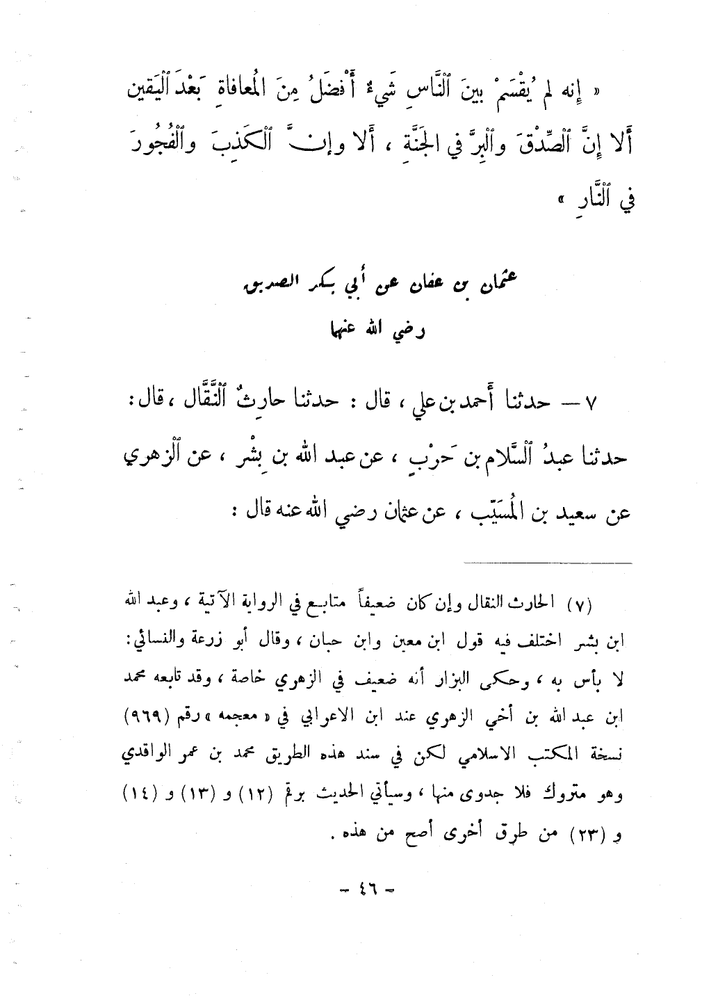 7 - حَدَّثَنَا أَحْمَدُ بْنُ عَلِيٍّ قَالَ: حَدَّثَنَا حَارِثٌ النَّقَّالُ قَالَ: حَدَّثَنَا عَبْدُ السَّلَامِ بْنُ حَرْبٍ , عَنْ عَبْدِ اللَّهِ بْنِ بِشْرٍ , عَنِ الزُّهْرِيِّ , عَنْ سَعِيدِ بْنِ الْمُسَيِّبِ , عَنْ عُثْمَانَ , رَضِيَ اللَّهُ عَنْهُ قَالَ -[47]-: لَمَّا قُبِضَ النَّبِيُّ صَلَّى اللهُ عَلَيْهِ وَسَلَّمَ وُسْوِسَ نَاسٌ مِنْ أَصْحَابِهِ , وَكُنْتُ فِيمَنْ وُسْوِسَ , فَمَرَّ عَلَيَّ عُمَرُ رَضِيَ اللَّهُ عَنْهُ , فَسَلَّمَ عَلَيَّ , فَلَمْ أَرُدَّ عَلَيْهِ , فَأَتَى أَبَا بَكْرٍ رَضِيَ اللَّهُ عَنْهُ , فَشَكَانِي إِلَيْهِ , فَجَاءَ أَبُو بَكْرٍ رَضِيَ اللَّهُ عَنْهُ فَقَالَ: مَرَّ بِكَ أَخُوكَ فَسَلَّمَ عَلَيْكَ فَلَمْ تَرُدَّ عَلَيْهِ , قَالَ: فَقُلْتُ: وَاللَّهِ مَا شَعُرْتُ بِتَسْلِيمِهِ عَلَيَّ , وَإِنِّي عَنْ ذَلِكَ لَفِي شُغْلٍ , قَالَ: وَمَا شَغَلَكَ؟ قَالَ: قُلْتُ: قُبِضَ رَسُولُ اللَّهِ صَلَّى اللهُ عَلَيْهِ وَسَلَّمَ قَبْلَ أَنَّ أَسْأَلَهُ عَنْ نَجَاةِ هَذَا الْأَمْرِ , قَالَ: فَقَدْ سَأَلْتُهُ , قَالَ: فَقُمْتُ إِلَيْهِ فَاعْتَنَقْتُهُ , وَقُلْتُ: بِأَبِي أَنْتَ وَأُمِّي , أَحَقٌّ بِذَلِكَ؟ قَالَ: قَدْ سَأَلْتُ رَسُولَ اللَّهِ صَلَّى اللهُ عَلَيْهِ وَسَلَّمَ عَنْ نَجَاةِ هَذَا الْأَمْرِ , قَالَ: «§مَنْ قَبِلَ الْكَلِمَةَ الَّتِي عَرَضْتُهَا عَلَى عَمِّي عِنْدَ الْمَوْتِ هِيَ لَهُ نَجَاةٌ»