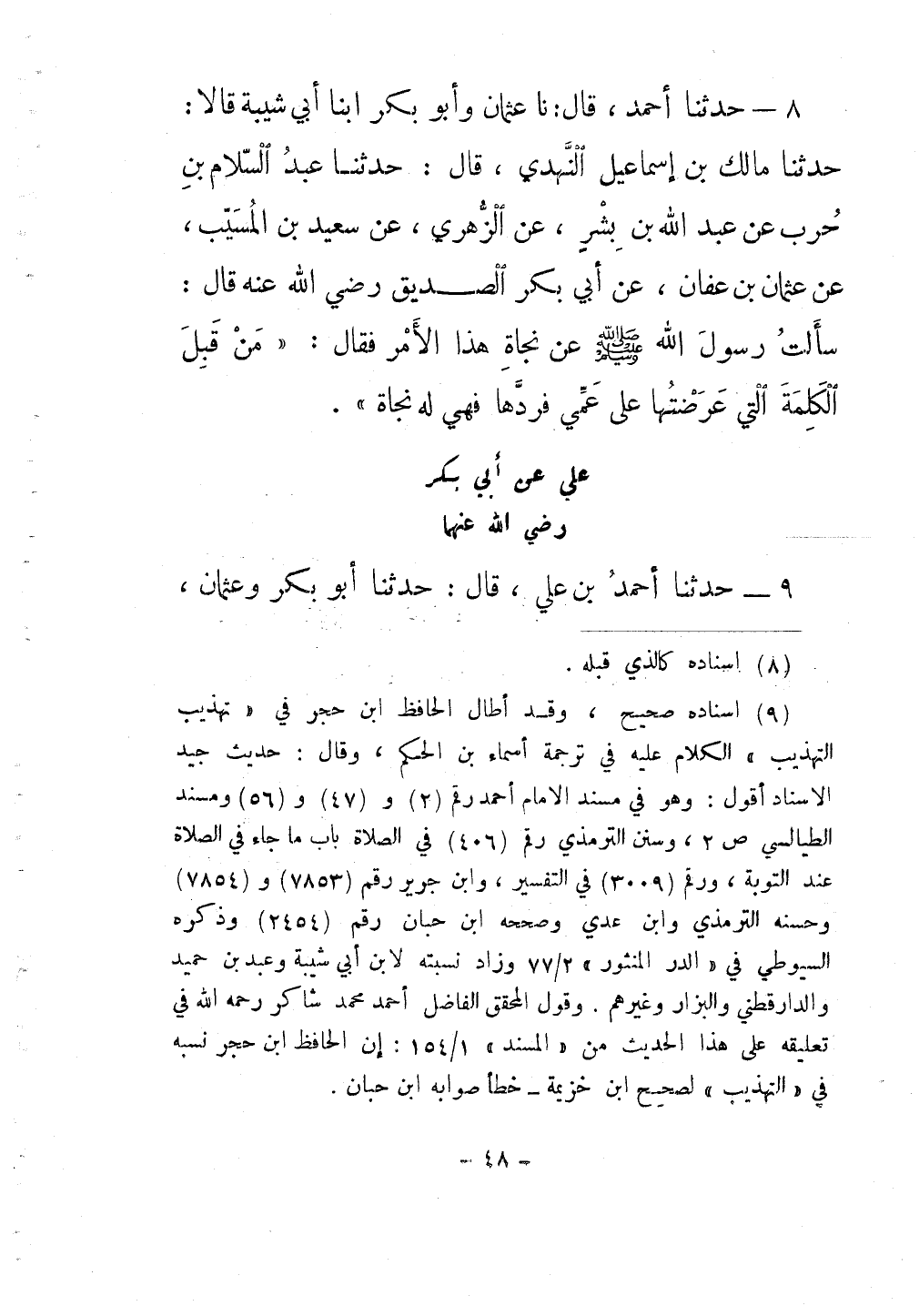 8 - حَدَّثَنَا أَحْمَدُ بْنُ عَلِيٍّ قَالَ: نَا عُثْمَانُ , وَأَبُو بَكْرٍ ابْنَا أَبِي شَيْبَةَ قَالَا: حَدَّثَنَا مَالِكُ بْنُ إِسْمَاعِيلَ النَّهْدِيُّ قَالَ: حَدَّثَنَا عَبْدُ السَّلَامِ بْنُ حَرْبٍ , عَنْ عَبْدِ اللَّهِ بْنِ بِشْرٍ , عَنِ الزُّهْرِيِّ , عَنْ سَعِيدِ بْنِ الْمُسَيِّبِ , عَنْ عُثْمَانَ بْنِ عَفَّانَ , عَنْ أَبِي بَكْرٍ الصِّدِّيقِ رَضِيَ اللَّهُ عَنْهُ قَالَ: سَأَلْتُ رَسُولَ اللَّهِ صَلَّى اللهُ عَلَيْهِ وَسَلَّمَ عَنْ نَجَاةِ هَذَا الْأَمْرِ؟ فَقَالَ: «§مَنْ قَبِلَ الْكَلِمَةَ الَّتِي عَرَضْتُهَا عَلَى عَمِّي فَرَدَّهَا فَهِيَ لَهُ نَجَاةٌ»