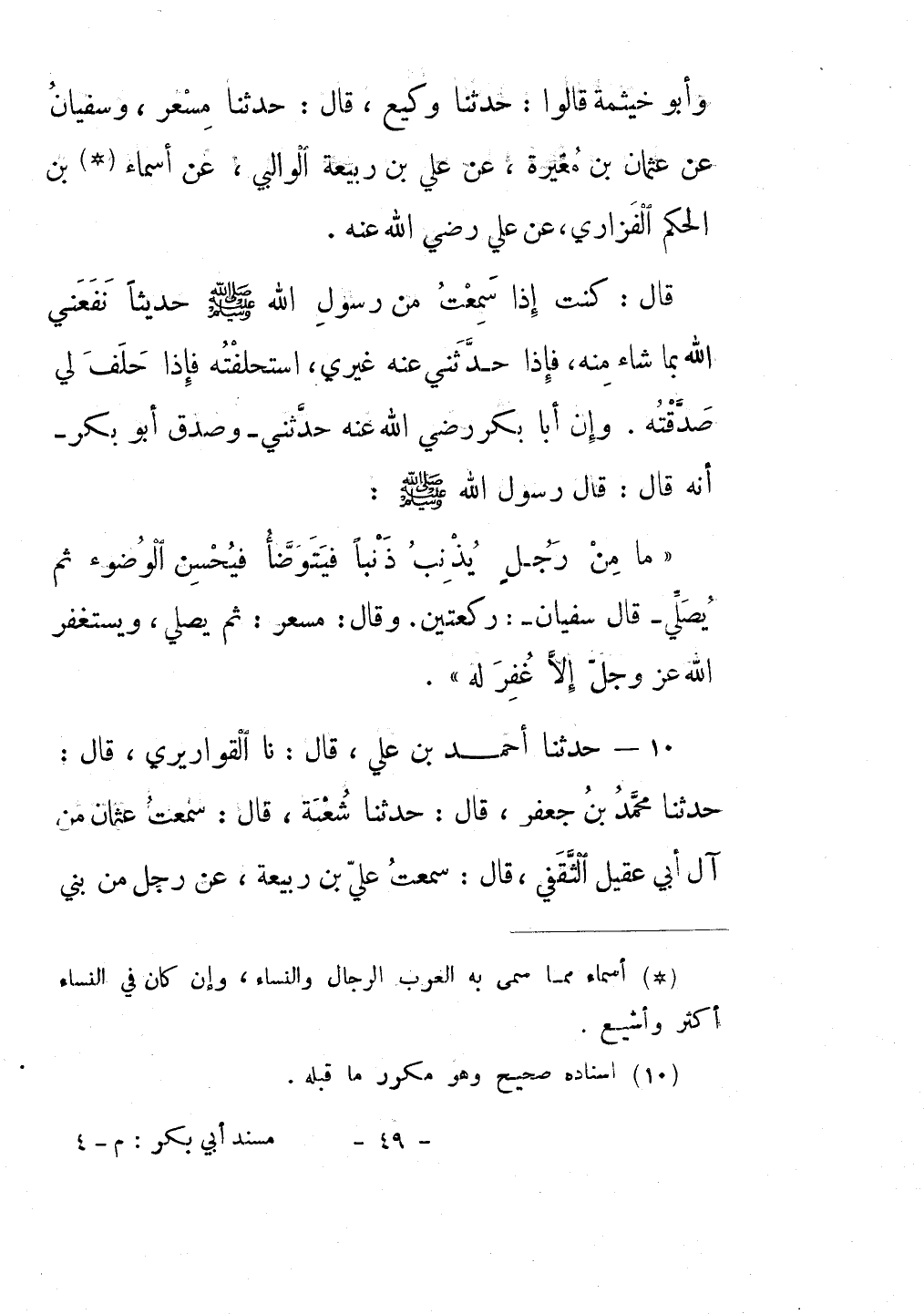 10 - حَدَّثَنَا أَحْمَدُ بْنُ عَلِيٍّ قَالَ: نَا الْقَوَارِيرِيُّ قَالَ: حَدَّثَنَا مُحَمَّدُ بْنُ جَعْفَرٍ قَالَ: حَدَّثَنَا شُعْبَةُ قَالَ: سَمِعْتُ عُثْمَانَ مِنَ آلِ أَبِي عَقِيلٍ الثَّقَفِيِّ قَالَ: سَمِعْتُ عَلِيَّ بْنَ رَبِيعَةَ , عَنْ رَجُلٍ مِنْ بَنِي -[50]- فَزَارَةَ يُقَالُ لَهُ: أَسْمَاءُ أَوِ ابْنُ أَسْمَاءَ , عَنْ عَلِيِّ بْنِ أَبِي طَالِبٍ , رَضِيَ اللَّهُ عَنْهُ قَالَ: كُنْتُ إِذَا سَمِعْتُ مِنْ رَسُولِ اللَّهِ صَلَّى اللهُ عَلَيْهِ وَسَلَّمَ شَيْئًا نَفَعَنِي اللَّهُ بِمَا شَاءَ مِنْهُ أَنْ يَنْفَعُنِي , فَحَدَّثَنِي أَبُو بَكْرٍ رَضِيَ اللَّهُ عَنْهُ - وَصَدَقَ أَبُو بَكْرٍ - عَنِ النَّبِيِّ صَلَّى اللهُ عَلَيْهِ وَسَلَّمَ أَنَّهُ قَالَ: " §مَا مِنْ عَبْدٍ - قَالَ شُعْبَةُ: وَأَحْسِبُهُ قَالَ: مُسْلِمٍ - يُذْنِبُ ذَنْبًا , ثُمَّ يَتَوَضَّأُ ثُمَّ يُصَلِّي رَكْعَتَيْنِ , ثُمَّ يَسْتَغْفِرُ اللَّهَ لِذَلِكَ الذَّنْبِ إِلَّا غُفِرَ لَهُ " قَالَ شُعْبَةُ: ثُمَّ قَرَأَ إِحْدَى هَاتَيْنِ الْآيَتَيْنِ {مَنْ يَعْمَلْ سُوءًا يُجْزَ بِهِ} [النساء: 123] , {وَالَّذِينَ إِذَا فَعَلُوا فَاحِشَةً أَوْ ظَلَمُوا أَنْفُسَهُمْ} [آل عمران: 135]