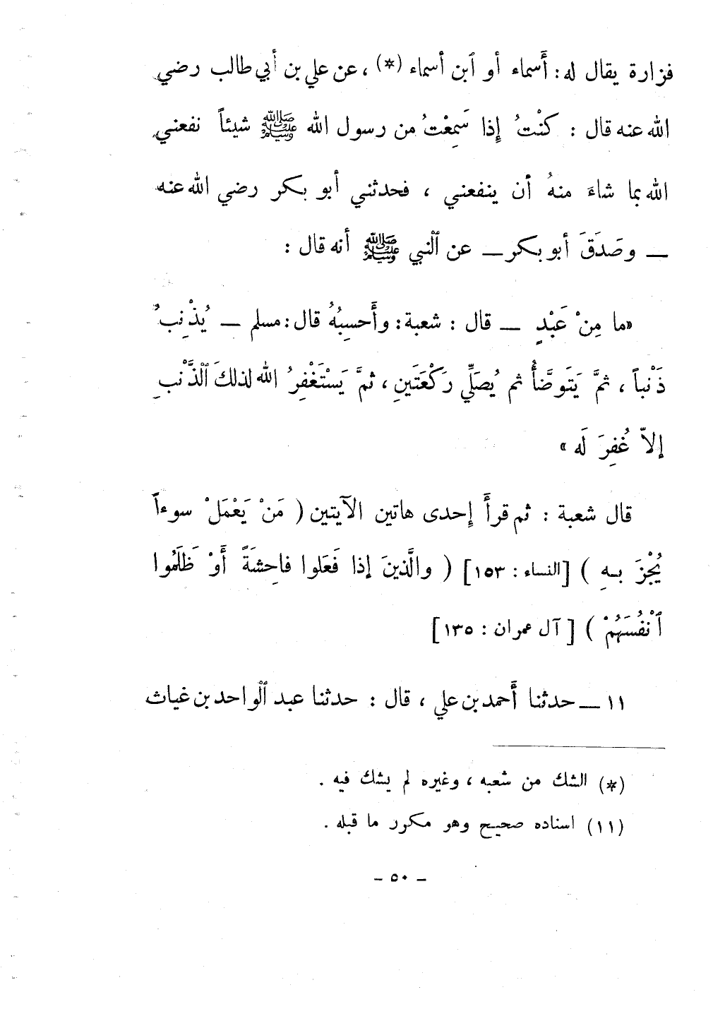 11 - حَدَّثَنَا أَحْمَدُ بْنُ عَلِيٍّ قَالَ: حَدَّثَنَا عَبْدُ الْوَاحِدِ بْنُ غِيَاثٍ قَالَ: حَدَّثَنَا أَبُو عَوَانَةَ , عَنْ عُثْمَانَ بْنِ الْمُغِيرَةِ , عَنْ عَلِيِّ بْنِ رَبِيعَةَ , عَنْ أَسْمَاءَ بْنِ الْحَكَمِ الْفَزَارِيِّ قَالَ: سَمِعْتُ عَلِيًّا رَضِيَ اللَّهُ عَنْهُ يَقُولُ: كُنْتُ امْرَءًا إِذَا سَمِعْتُ مِنَ رَسُولِ اللَّهِ صَلَّى اللهُ عَلَيْهِ وَسَلَّمَ حَدِيثًا نَفَعَنِي اللَّهُ مِنْهُ بِمَا شَاءَ أَنْ يَنْفَعُنِي , وَإِذَا حَدَّثَنِي عَنْهُ أَحَدٌ مِنْ أَصْحَابِهِ اسْتَحْلَفْتُهُ , فَإِذَا حَلَفَ لِي صَدَّقْتُهُ , وَحَلَفَ لِي أَبُو بَكْرٍ , وَصَدَقَ أَبُو بَكْرٍ أَنَّهُ سَمِعَ النَّبِيَّ صَلَّى اللهُ عَلَيْهِ وَسَلَّمَ يَقُولُ: «§مَا مِنْ رَجُلٍ يُذْنِبُ ذَنْبًا , فَيَتَوَضَّأُ , فَأَحْسَنَ الْوُضُوءَ , ثُمَّ صَلَّى وَاسْتَغْفَرَ اللَّهَ مِنْهُ إِلَّا غَفَرَ اللَّهُ لَهُ» قَالَ: ثُمَّ تَلَى {وَالَّذِينَ إِذَا فَعَلُوا فَاحِشَةً أَوْ ظَلَمُوا أَنْفُسَهُمْ ذَكَرُوا اللَّهَ فَاسْتَغْفِرُوا -[51]- لِذُنُوبِهِمْ} [آل عمران: 135] "