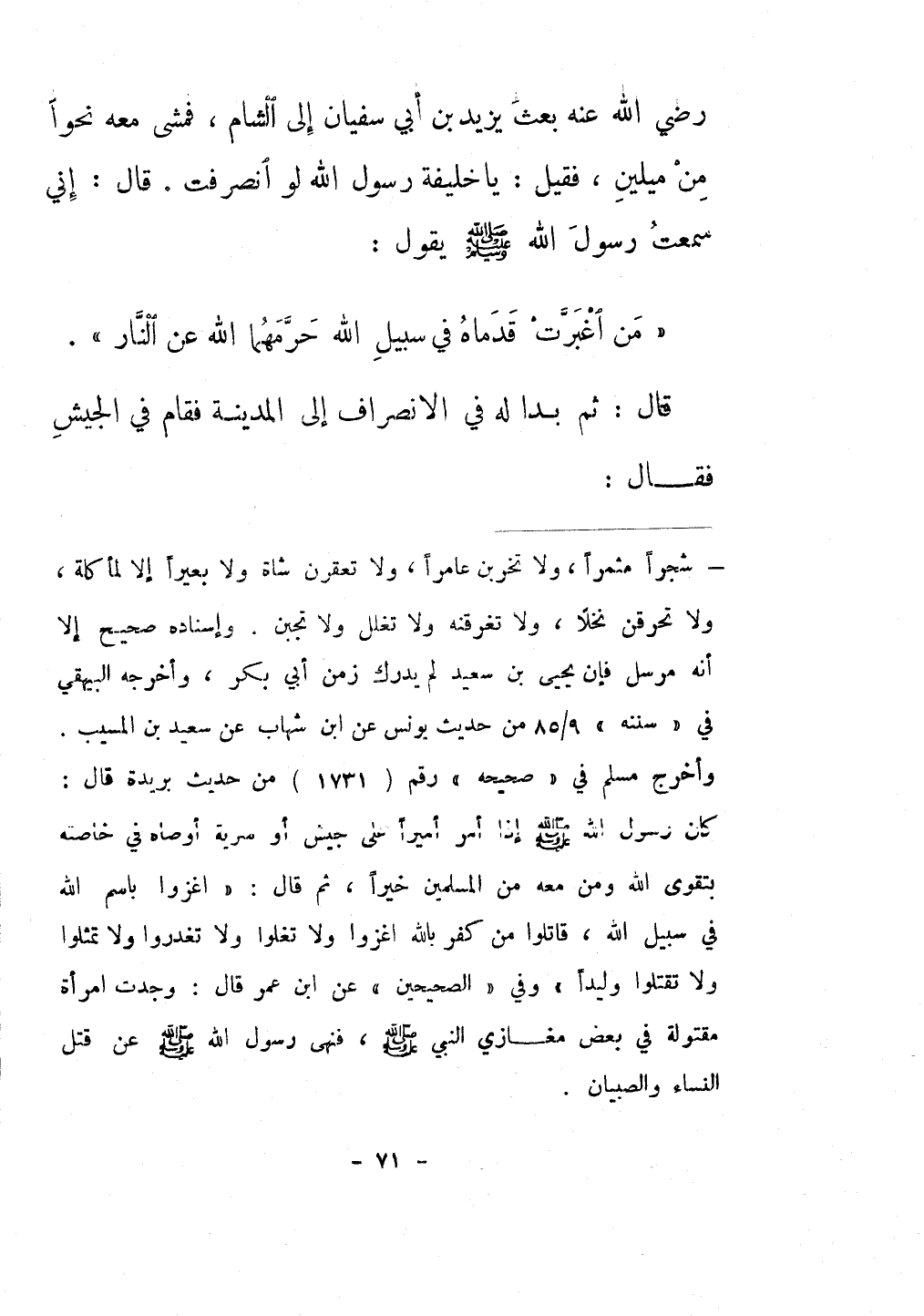 قَالَ: ثُمَّ بَدَا لَهُ فِي الِانْصِرَافِ إِلَى الْمَدِينَةِ , فَقَامَ فِي الْجَيْشِ فَقَالَ -[72]-: «§أُوصِيكُمْ بِتَقْوَى اللَّهِ لَا تَعْصُوا , وَلَا تَغُلُّوا , وَلَا تَجْبُنُوا , وَلَا تُغْرِقُوا نَخْلًا , وَلَا تَحْرِقُوا زَرْعًا , وَلَا تَحْبِسُوا بَهِيمَةً , وَلَا تَقْطَعُوا شَجَرَةً مُثْمِرَةً , وَلَا تَقْتُلُوا شَيْخًا كَبِيرًا , وَلَا صَبِيًّا صَغِيرًا , وَسَتَجِدُونَ أَقْوَامًا حَبَسُوا أَنْفُسَهُمْ لِلَّذِي حَبَسُوهَا فَذَرُوهُمْ وَمَا حَبَسُوا أَنْفُسَهُمْ لَهُ , وَسَتَجِدُونَ أَقْوَامًا قَدِ اتَّخَذْتِ الشَّيَاطِينُ أَوْسَاطَ رُءُوسِهِمْ أَفْحَاصًا فَاضْرِبُوا أَعْنَاقَهُمْ , وَسَتَرِدُونَ -[73]- بَلَدًا يَغْدُو عَلَيْكُمْ وَيَرُوحُ فِيهِ الطَّعَامُ وَالْأَلْوَانُ , فَلَا يَأْتِيَنَّكُمْ لَوْنٌ إِلَّا ذَكَرْتُمُ اسْمَ اللَّهِ عَلَيْهِ , وَلَا يُرْفَعُ لَوْنٌ إِلَّا حَمَدْتُمُ اللَّهَ عَزَّ وَجَلَّ»