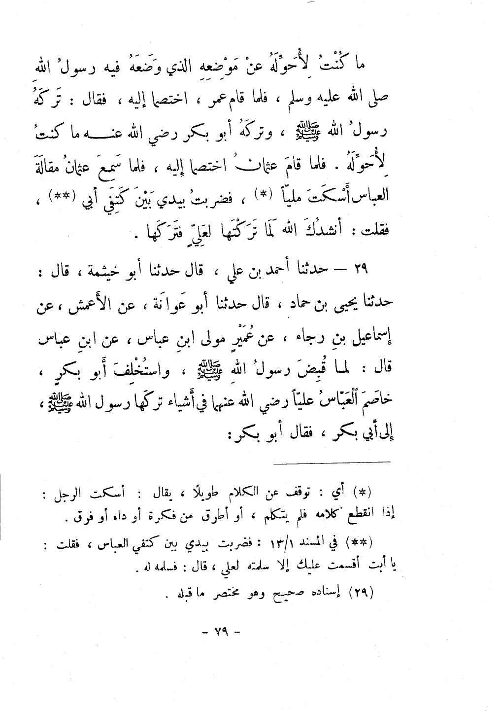 29 - حَدَّثَنَا أَحْمَدُ بْنُ عَلِيٍّ قَالَ: حَدَّثَنَا أَبُو خَيْثَمَةَ قَالَ: حَدَّثَنَا يَحْيَى بْنُ حَمَّادٍ قَالَ: حَدَّثَنَا أَبُو عَوَانَةَ , عَنِ الْأَعْمَشِ , عَنْ إِسْمَاعِيلَ بْنِ رَجَاءٍ , عَنْ عُمَيْرٍ مَوْلَى ابْنِ عَبَّاسٍ , عَنِ ابْنِ عَبَّاسٍ , قَالَ: " لَمَّا قُبِضَ رَسُولُ اللَّهِ صَلَّى اللهُ عَلَيْهِ وَسَلَّمَ وَاسْتُخْلِفَ أَبُو بَكْرٍ خَاصَمَ الْعَبَّاسُ عَلِيًّا رَضِيَ اللَّهُ عَنْهُمَا فِي أَشْيَاءَ تَرَكَهَا رَسُولُ اللَّهِ صَلَّى اللهُ عَلَيْهِ وَسَلَّمَ إِلَى أَبِي بَكْرٍ , فَقَالَ أَبُو بَكْرٍ: «§شَيْئًا تَرَكَهُ رَسُولُ اللَّهِ صَلَّى اللهُ عَلَيْهِ وَسَلَّمَ فَلَمْ يُحَرِّكْهُ فَلَا أُحَرِّكُهُ»