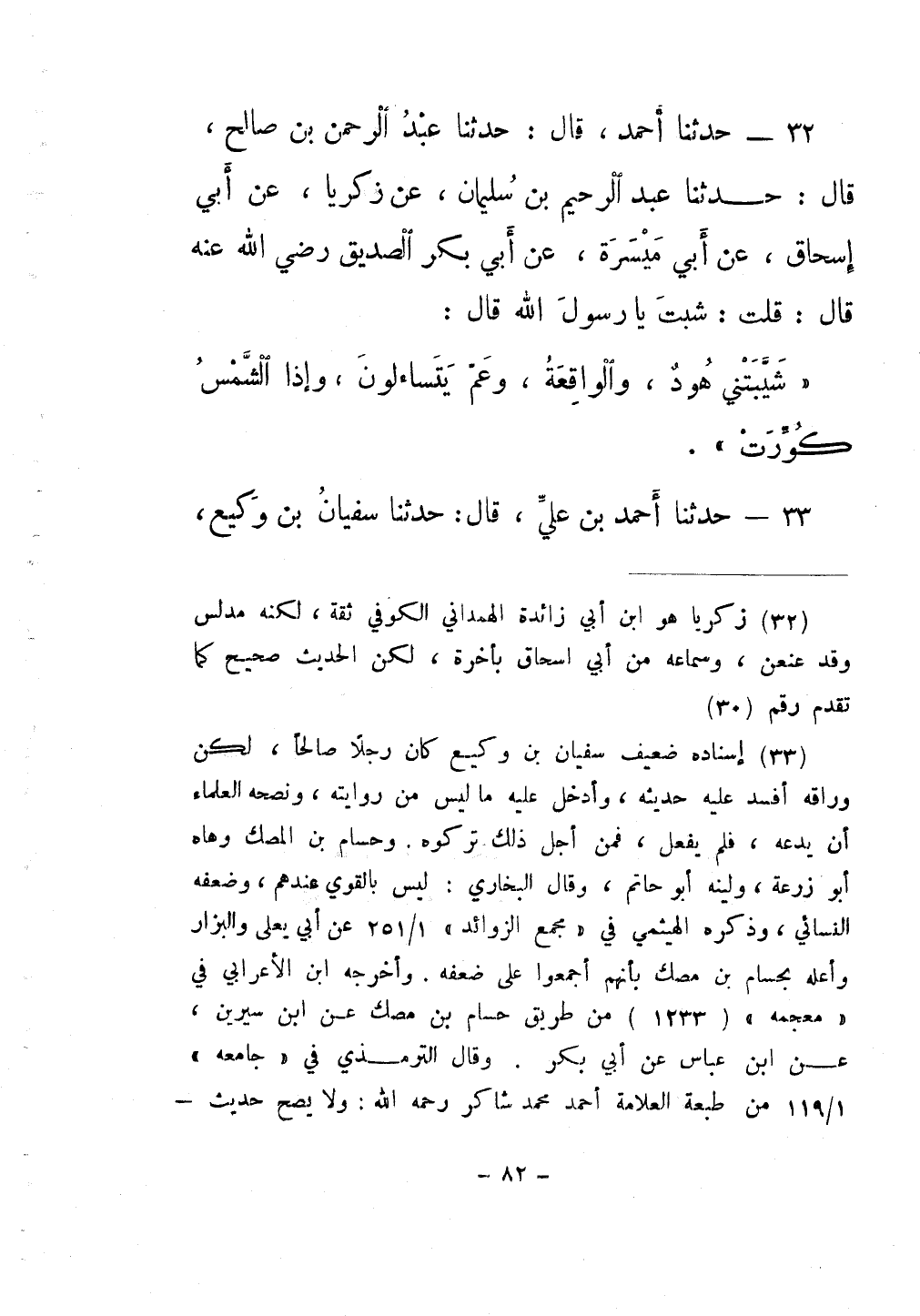 32 - حَدَّثَنَا أَحْمَدُ بْنُ عَلِيٍّ قَالَ: حَدَّثَنَا عَبْدُ الرَّحْمَنِ بْنُ صَالِحٍ قَالَ: حَدَّثَنَا عَبْدُ الرَّحِيمِ بْنُ سُلَيْمَانَ , عَنْ زَكَرِيَّا , عَنْ أَبِي إِسْحَاقَ , عَنْ أَبِي مَيْسَرَةَ , عَنْ أَبِي بَكْرٍ الصِّدِّيقِ , رَضِيَ اللَّهُ عَنْهُ قَالَ: قُلْتُ: شِبْتَ يَا رَسُولَ اللَّهِ , قَالَ: «§شَيَّبَتْنِي هُودٌ , وَالْوَاقِعَةُ , وَعَمَّ يَتَسَاءَلُونَ , وَإِذَا الشَّمْسُ كُوِّرَتْ»