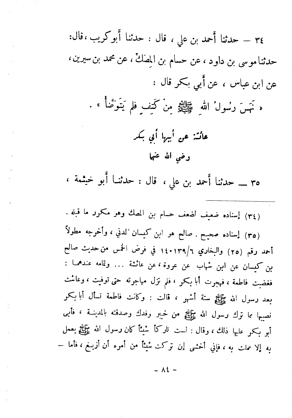 34 - حَدَّثَنَا أَحْمَدُ بْنُ عَلِيٍّ قَالَ: حَدَّثَنَا أَبُو كُرَيْبٍ قَالَ: حَدَّثَنَا مُوسَى بْنُ دَاوُدَ , عَنْ حُسَامِ بْنِ الْمِصَكِّ , عَنْ مُحَمَّدِ بْنِ سِيرِينَ , عَنِ ابْنِ عَبَّاسٍ , عَنْ أَبِي بَكْرٍ قَالَ: «§نَهَسَ رَسُولُ اللَّهِ صَلَّى اللهُ عَلَيْهِ وَسَلَّمَ مِنْ كَتِفٍ , فَلَمْ يَتَوَضَّأْ»